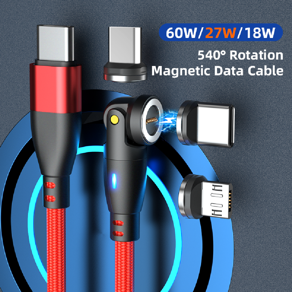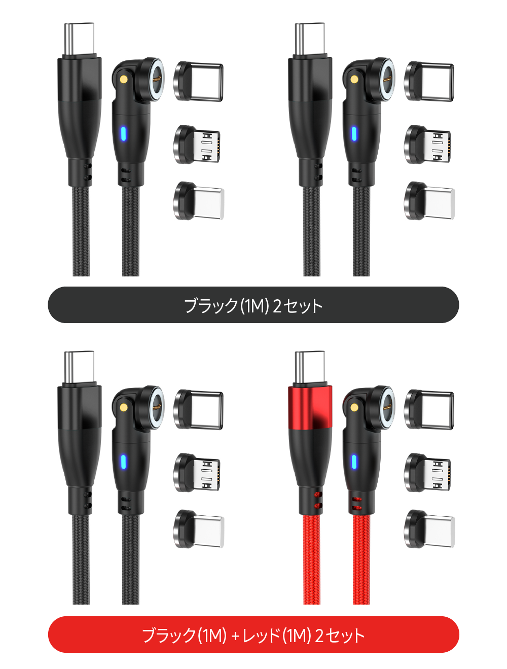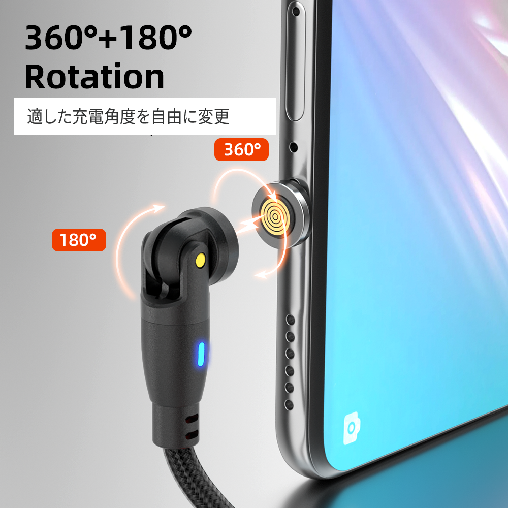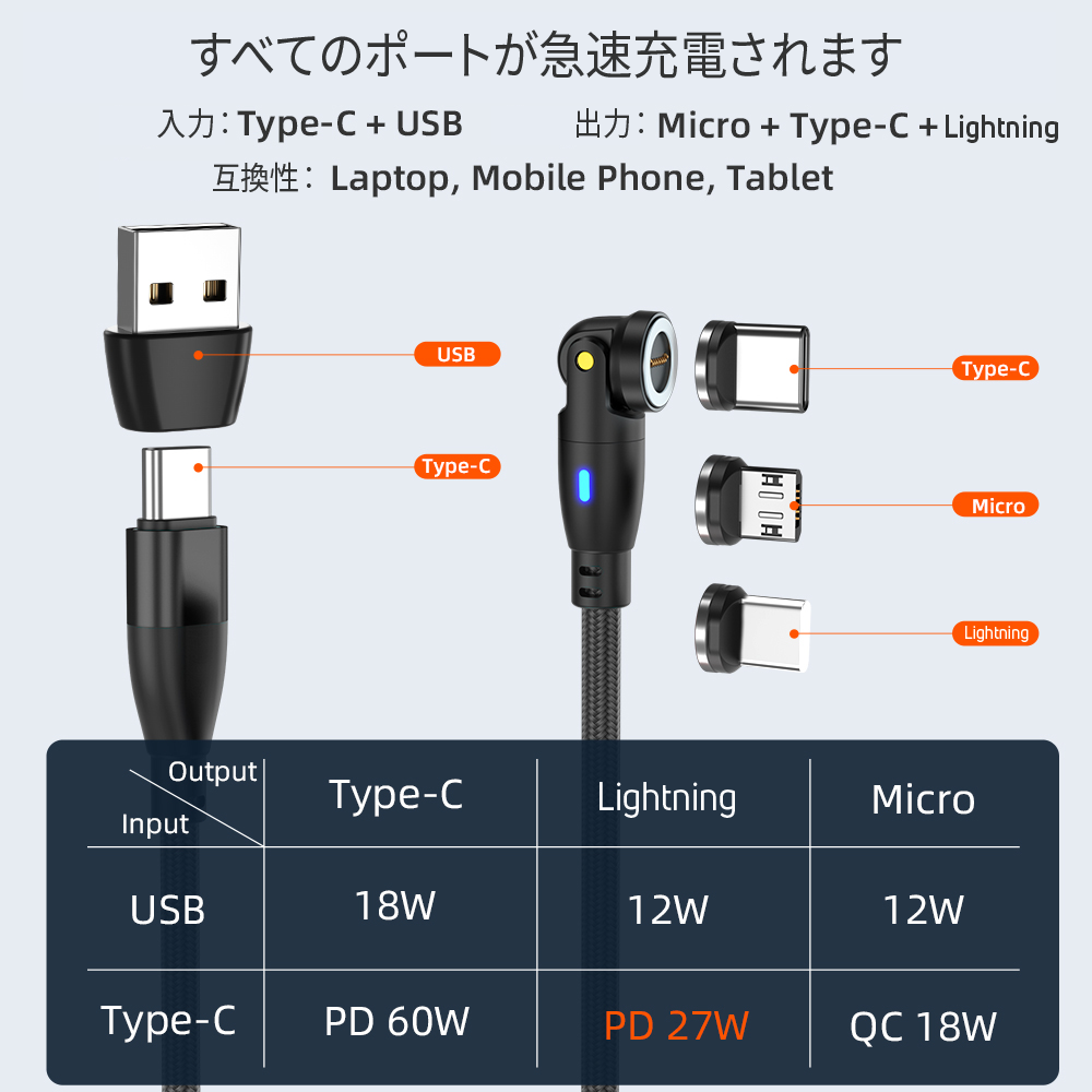 360度+180度の首振り構造/Type-C/USB/Micro/Lightning/60W/QC3.0/強靭なナイロン被覆/長さ1M/お得な2セット