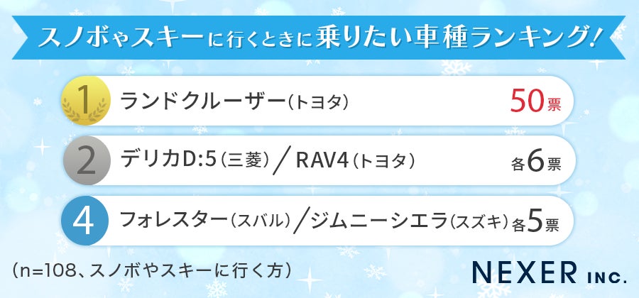 株式会社NEXER・スノボやスキーに行くときに乗りたい車に関する調査