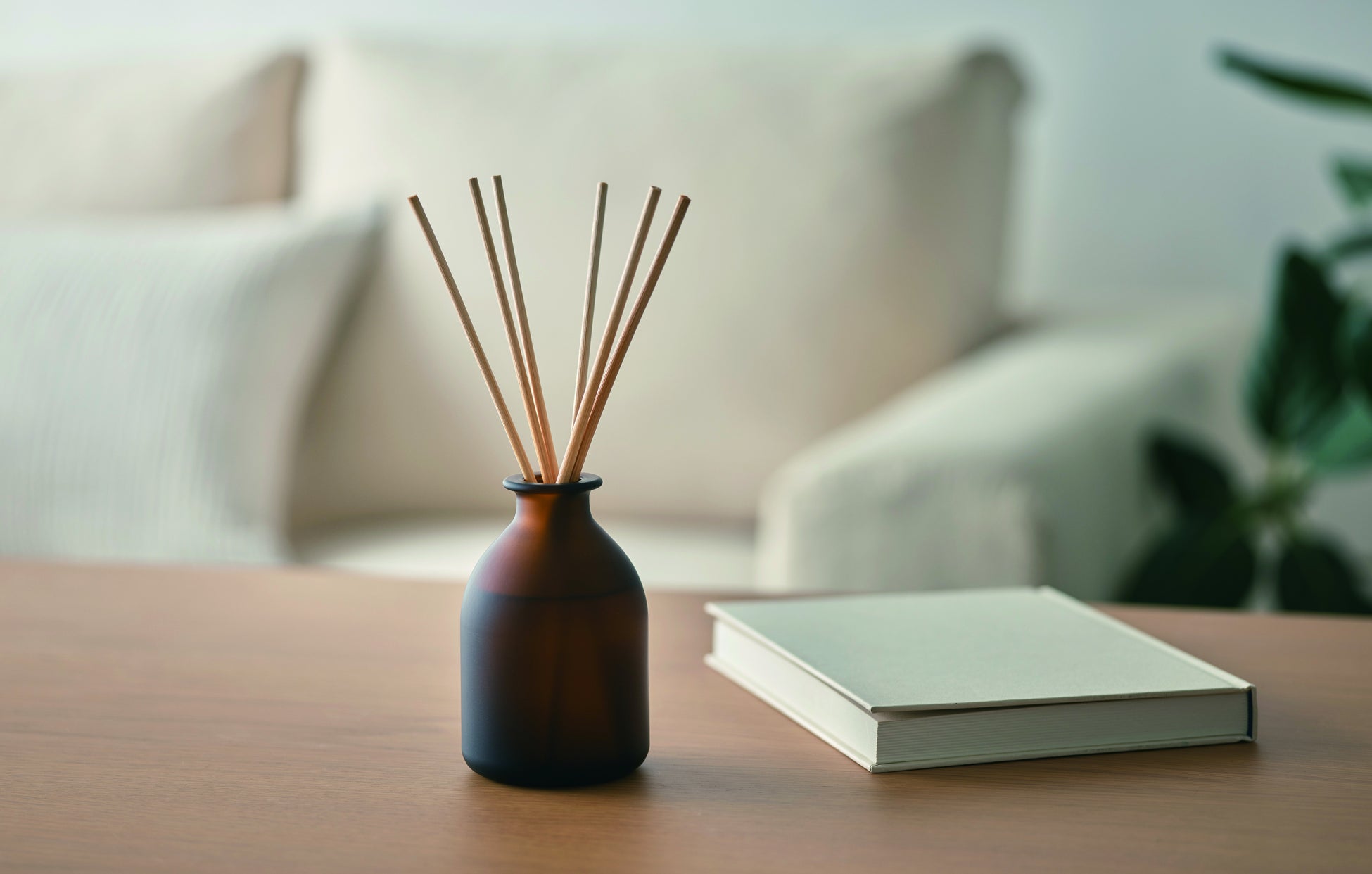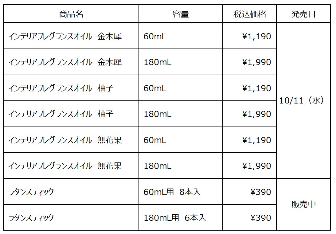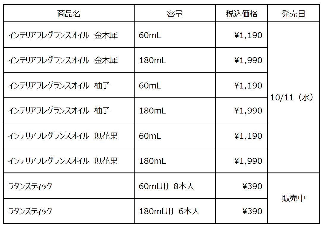 インテリアフレグランスオイルは、ボトルに別売りのラタンスティックを差し込むことで、空間で香りをお楽しみいただける商品です。香りを通じて季節を楽しんでいただくため、季節に合わせたインテリアフレグランスオイルを期間限定で発売します。定番の香りは、「グリーン」、「シトラス」、「ハーバル」、「フローラル」、「クリア」、「ウッディ」の6種類がありますが、それに加えて、今回秋を感じる「金木犀」「柚子」「無花果」の60mLと180mlを発売します。