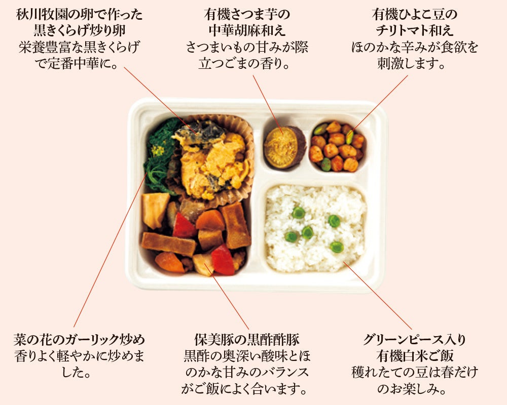 豚肉、菜の花:愛知県産 米:福井県産 卵:山口県産 ひよこ豆:アメリカ産 さつま芋:千葉県産 グリーンピース:鹿児島県産