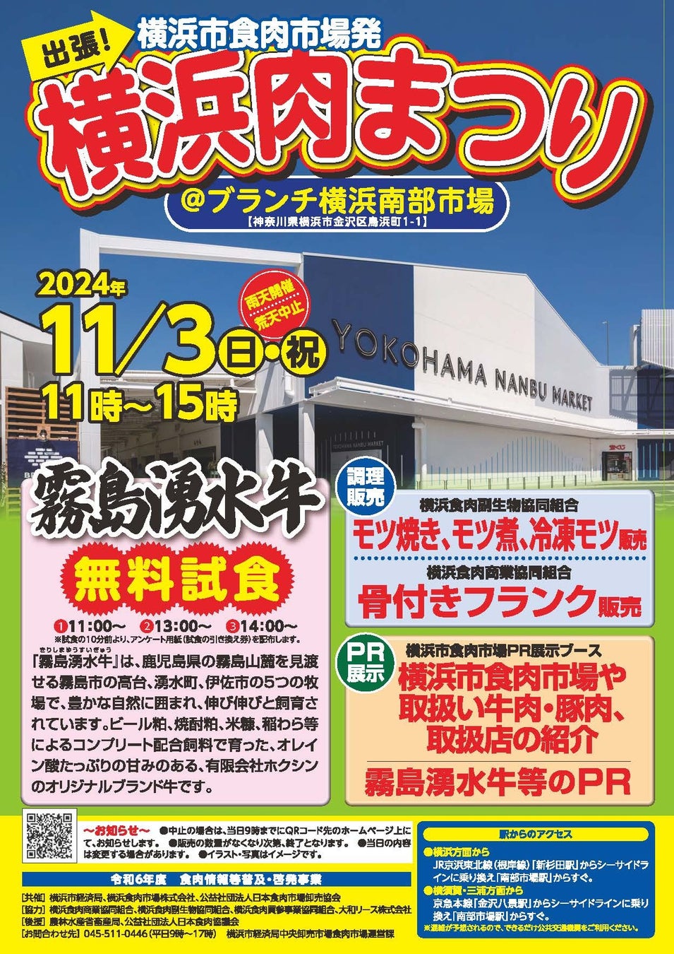 令和6年11月3日(日・祝)11時00分~15時00分 (雨天開催 荒天中止) ※中止の場合は、当日9時までに横浜市ホームページ上にて、お知らせします。 https://www.city.yokohama.lg.jp/business/kigyoshien/chuoshijo/nikumatsuri.html |