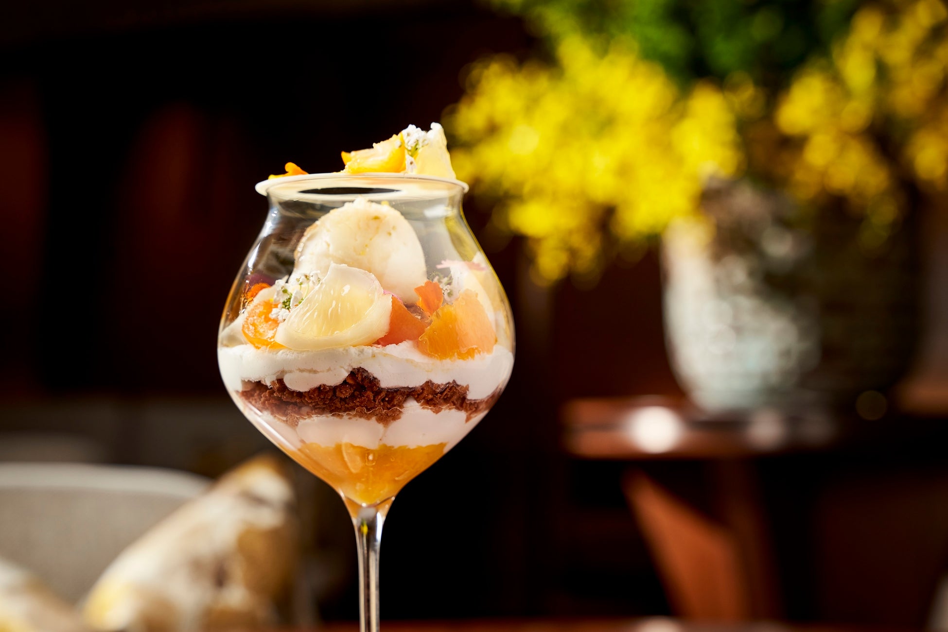 繊細にあしらったトップ部分が華やかさを演出します。さっぱりと口当たりを軽く仕上げたオレンジとレモンのパルフェの下には、レモン味のカスタードやアールグレイのブリュレ、ホワイトチョコレートのゆずシャンティ、チョコレートクランチの層を重ねます。オレンジや日向夏などの果肉との組み合わせを一口一口食べ進めるたびにお楽しみいただけます。