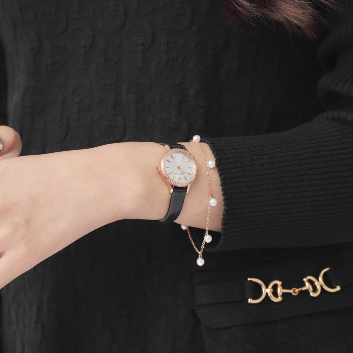 腕時計と合わせて楽しめるパールビーズが6粒連なるブレスレットが付属します。