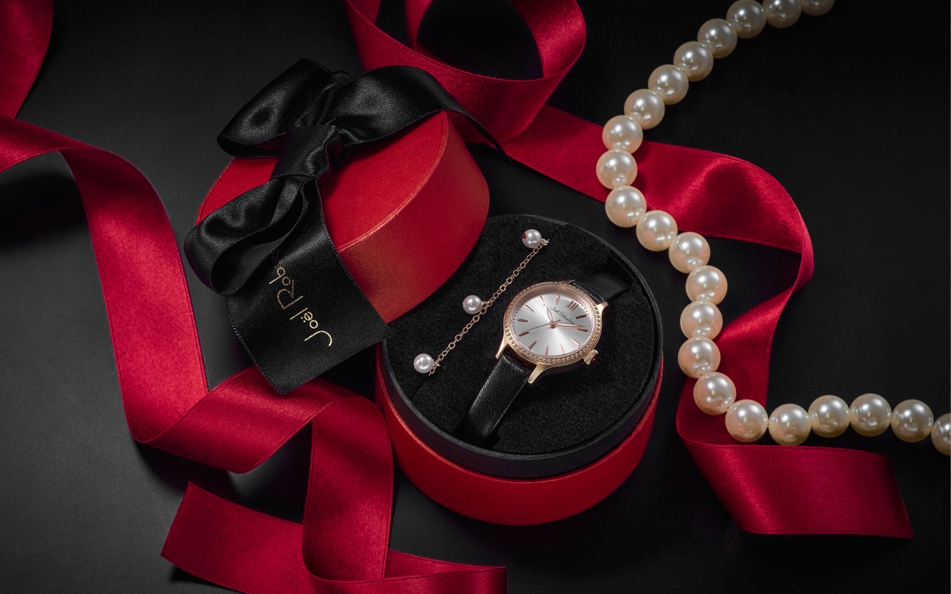 ホリデーシーズンのギフトにおすすめな、大きいリボンが目を惹くオリジナルギフトボックスとオリジナルブレスレット付き。
