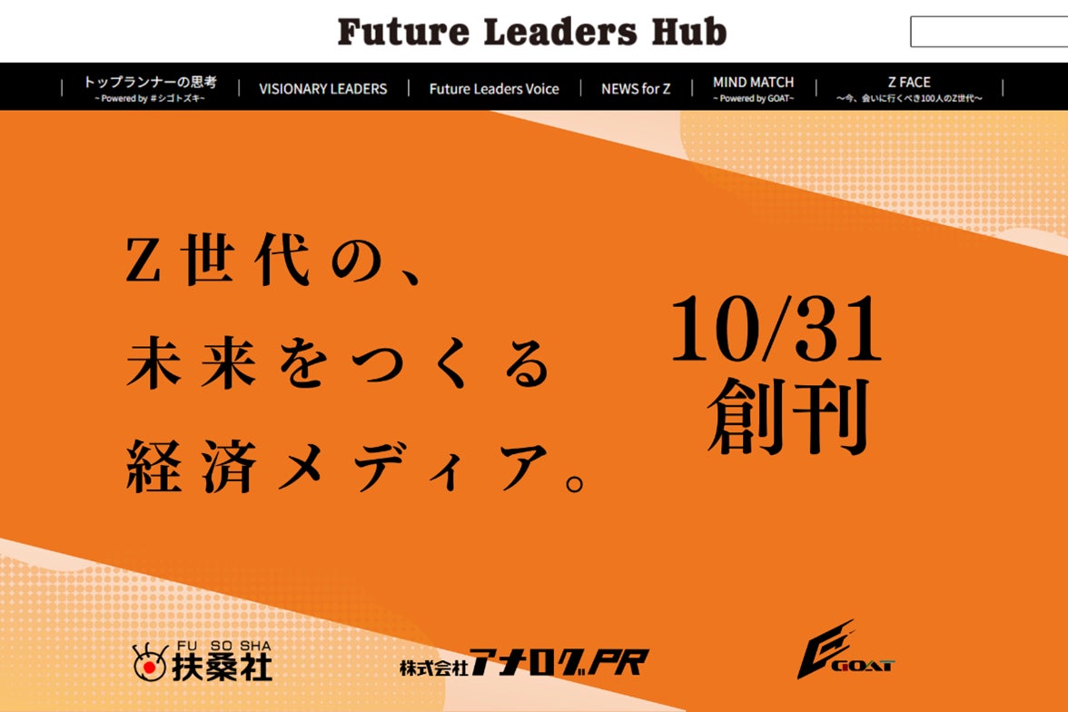 株式会社扶桑社(本社:東京都港区、代表取締役社長:秋尾弘史)は、この度、Z世代の未来をつくる新経済メディア「Future Leaders Hub」を2025年10月31日(金)に創刊することをお知らせいたします。本メディアは、次世代を担うZ世代が未来を自由に描き、挑戦できる社会の実現に貢献するため、運営パートナーの株式会社アナログPR(本社:東京都港区、代表取締役:松浦啓介)、GOAT株式会社(本社:大阪府大阪市、代表取締役:谷手琉加)とともに若者の視点と経営者の知見が融合する「共創のプラットフォーム」となることを目指してまいります。