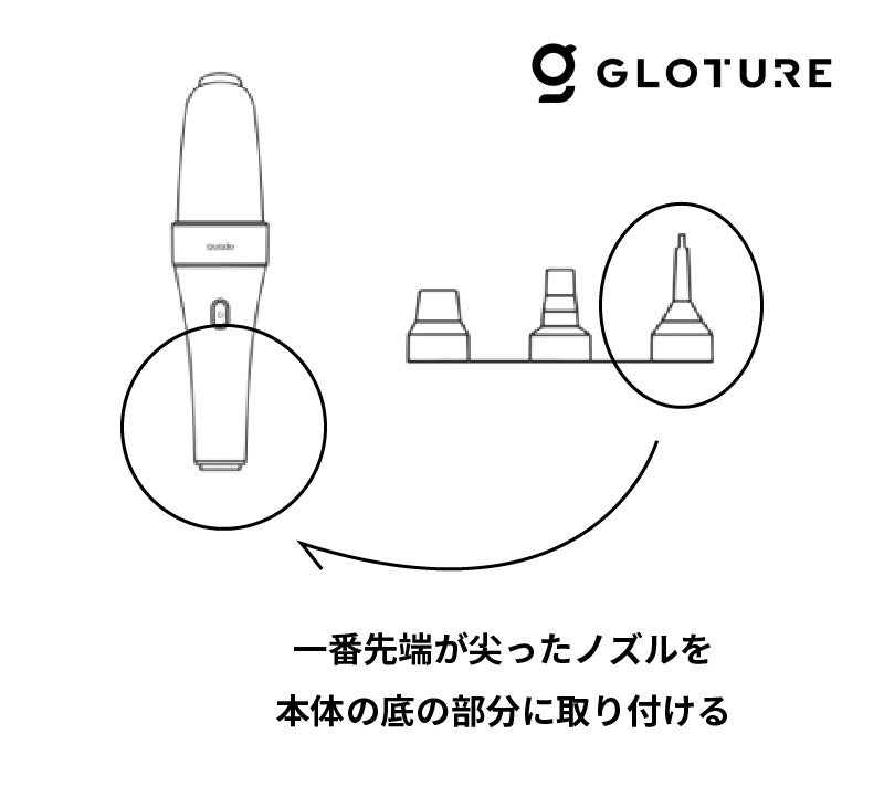 使い方はとても簡単!本体の底の部分に、付属品の一番尖ったノズルをセットして、電源を入れるだけ。