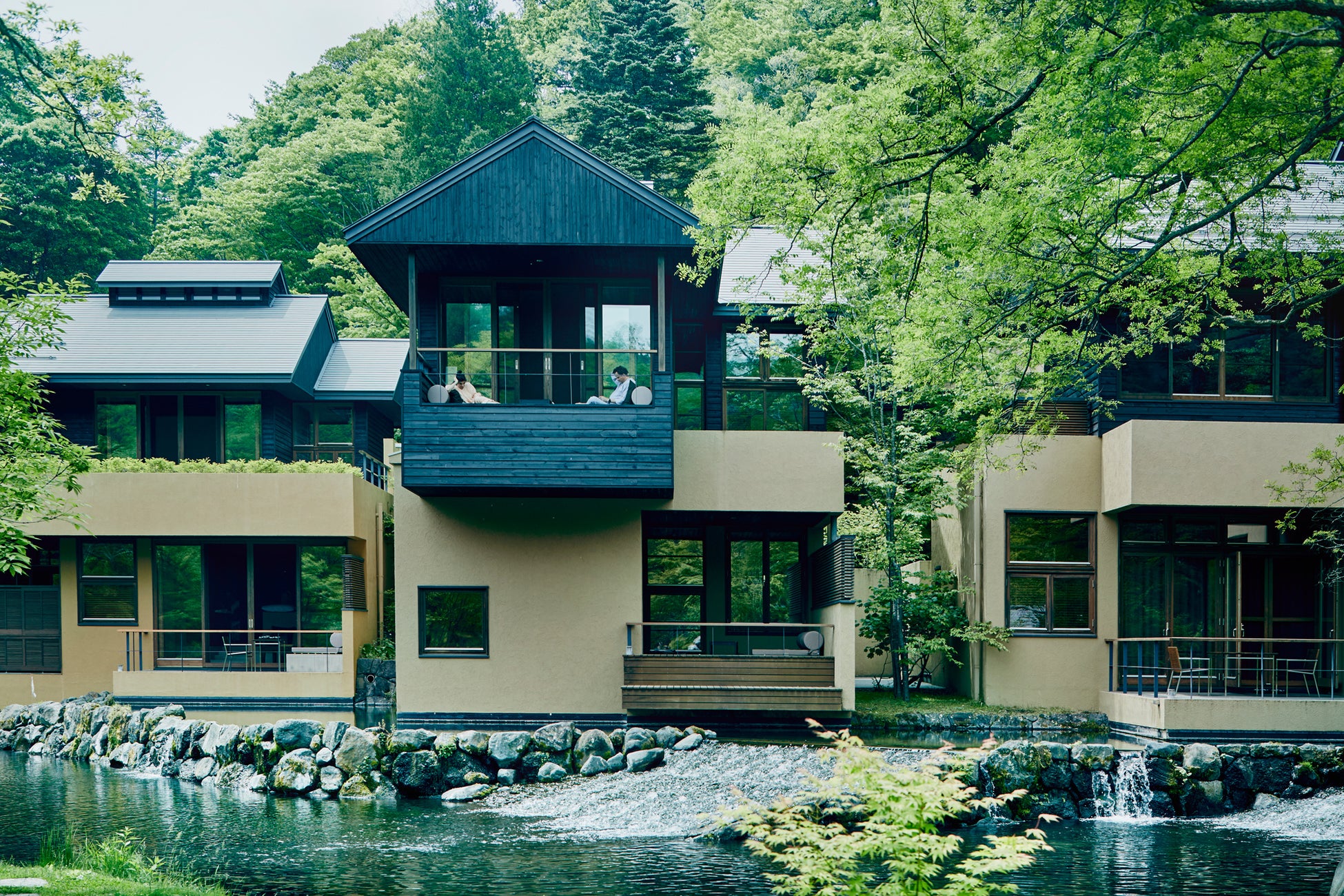 ⾕の集落に滞在する。離れの客室は⽔辺を囲み、部屋のテラスからは季節のうつろいが感じられます。「軽井沢野⿃の森」に⾯した豊かな⾃然環境にて、休息の時間を満喫できる滞在型の宿泊施設です。