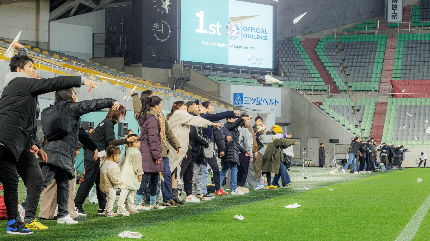 2024年12月16日(月)の寒さが厳しい朝に阪神タイガース梅野選手ファン300名がノエビアスタジアム神戸に集まりました。世界記録を目指して阪神タイガース梅野選手が紙飛行機を飛ばす姿を見届けようと地元の野球ファンを中心に多くの方が応援にかけつけました。当日は、集まった300名の方が紙飛行機へ「誰かに届けたいメッセージ」を書き込み、それぞれで紙飛行機を飛ばし想いを届けようとする姿が見られました。そしていよいよ阪神タイガース梅野選手の挑戦が始まりました。紙飛行機は、応援に押されながら空高く飛び、一度は落ちそうになりながらも持ち直し、64.652mを記録しました。惜しくも世界記録には届かなかったものの、現日本記録である61.82mを更新いたしました。