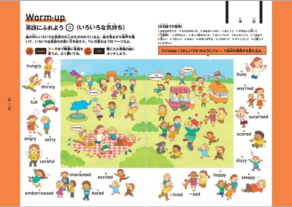 イラストを見ながら英語に触れられる絵じてん形式の「Warm-up」のコーナーや、習った単語でクイズに答えるコーナーなど、英語に親しみ、好奇心を育むコーナーも充実しています。