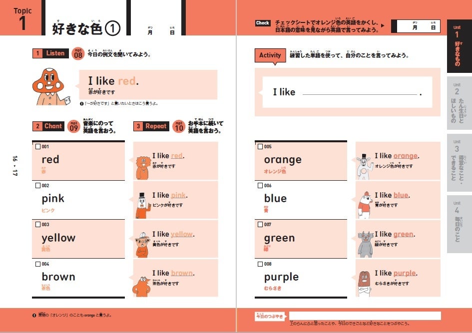 総まとめ「Challenge」コーナーでは、学んだ文を使って自分のことを言う練習をします。小学生の「話したい」気持ちを伸ばすと同時に、「話せる」達成感を感じられます。