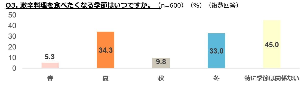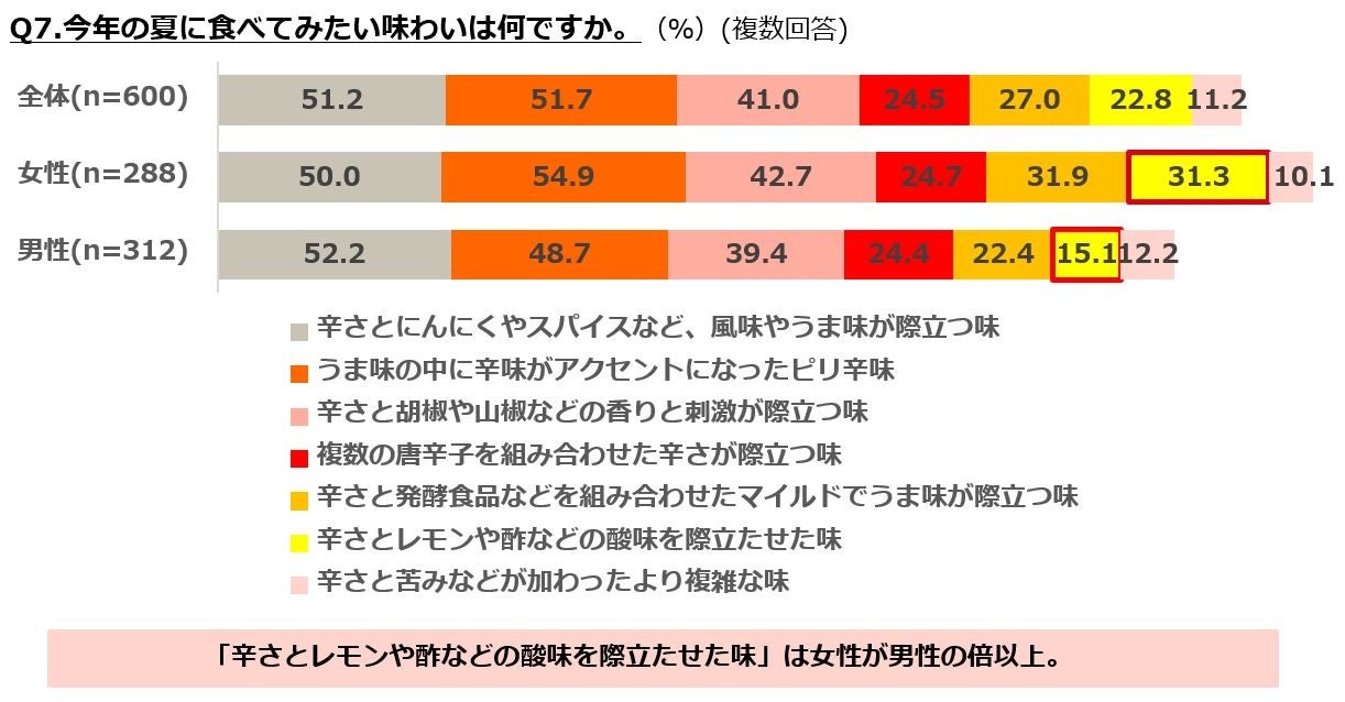 ・今夏に食べたい激辛料理は、「うま味の中に辛味がアクセントになったピリ辛味」と「辛さとにんにくやスパイスなど、風味やうま味が際立つ味」がほぼ同率。「辛さとレモンや酢などの酸味を際立たせた味」は女性が男性の倍以上。