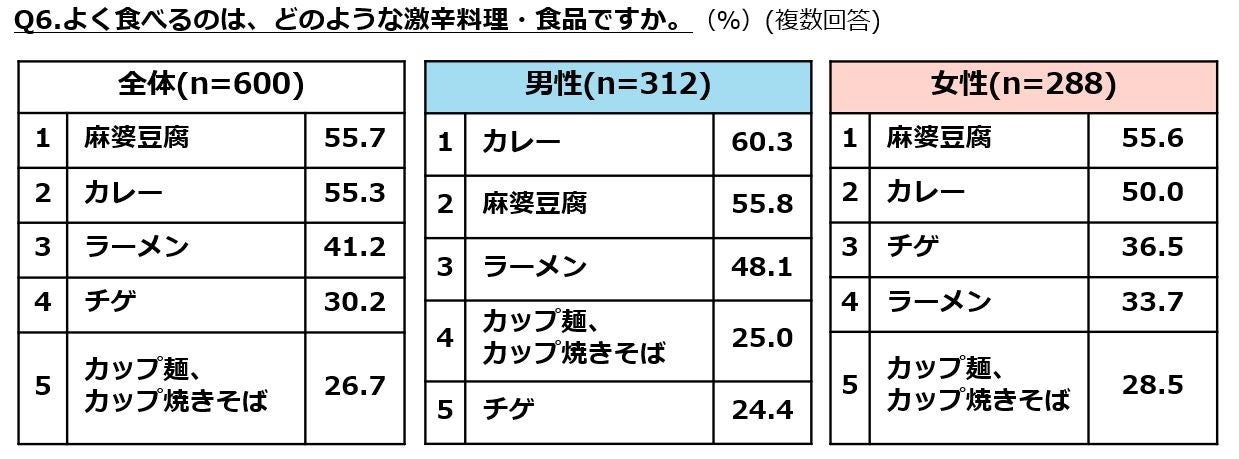 ・よく食べる激辛料理は、「麻婆豆腐」「カレー」「ラーメン」がTOP3。