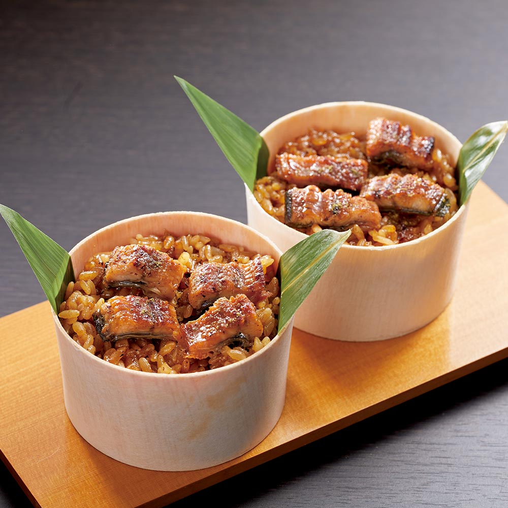 国産うなぎの蒲焼きの刻みをのせたうなぎおこわ。 ⽼舗秘伝のタレが、美味しさを引き出します。 天然素材の⽊の器が、おこわのもっちりした⾷感を保ちながらさわやかな笹の⾹りが⾷欲をそそります。