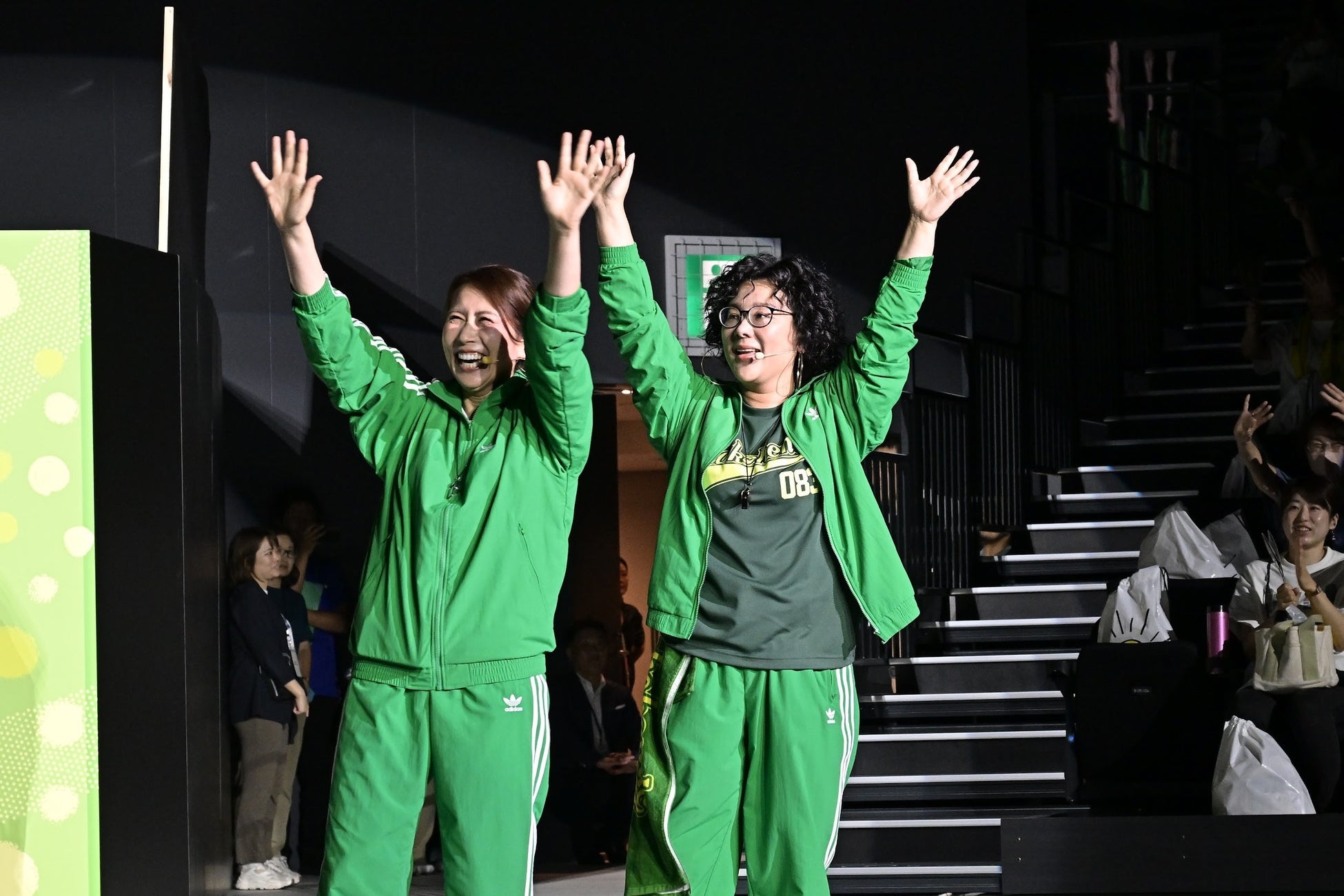 ジャッジャッジャジャンとかき鳴らされるギター。ピンスポットが照らし出したのは、観客席後方に現れたテツ&トモのお2人です。縦横無尽に会場内を駆け回り、会場のボルテージは最高潮に。過去の番組エピソードをネタにした「スー美香なんでだろう」も披露し、会場は笑いの渦に包まれました。