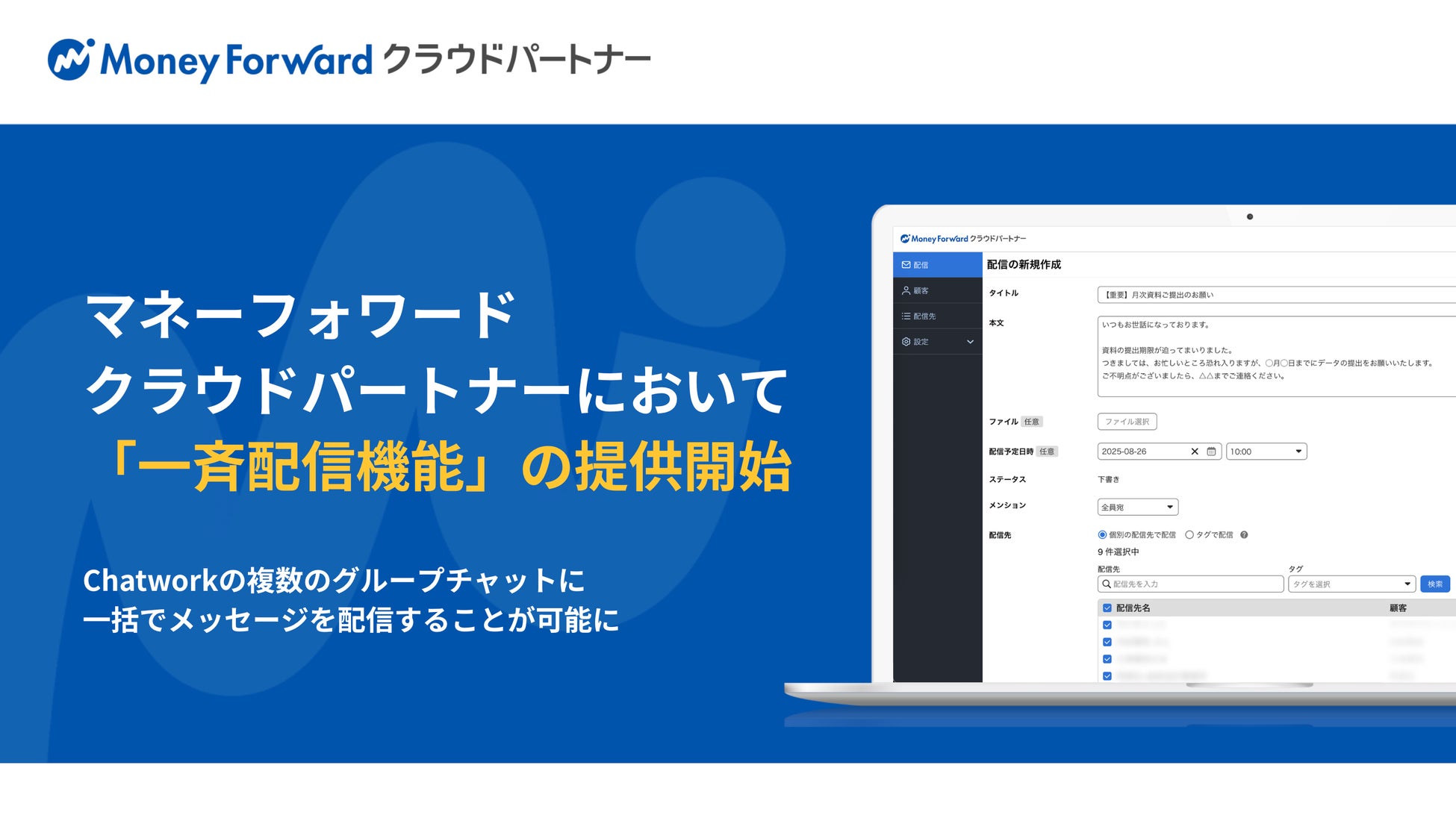 士業事務所向けの顧客管理システム『マネーフォワード クラウドパートナー』において『Chatwork』に一斉配信ができる「一斉配信機能」を提供開始