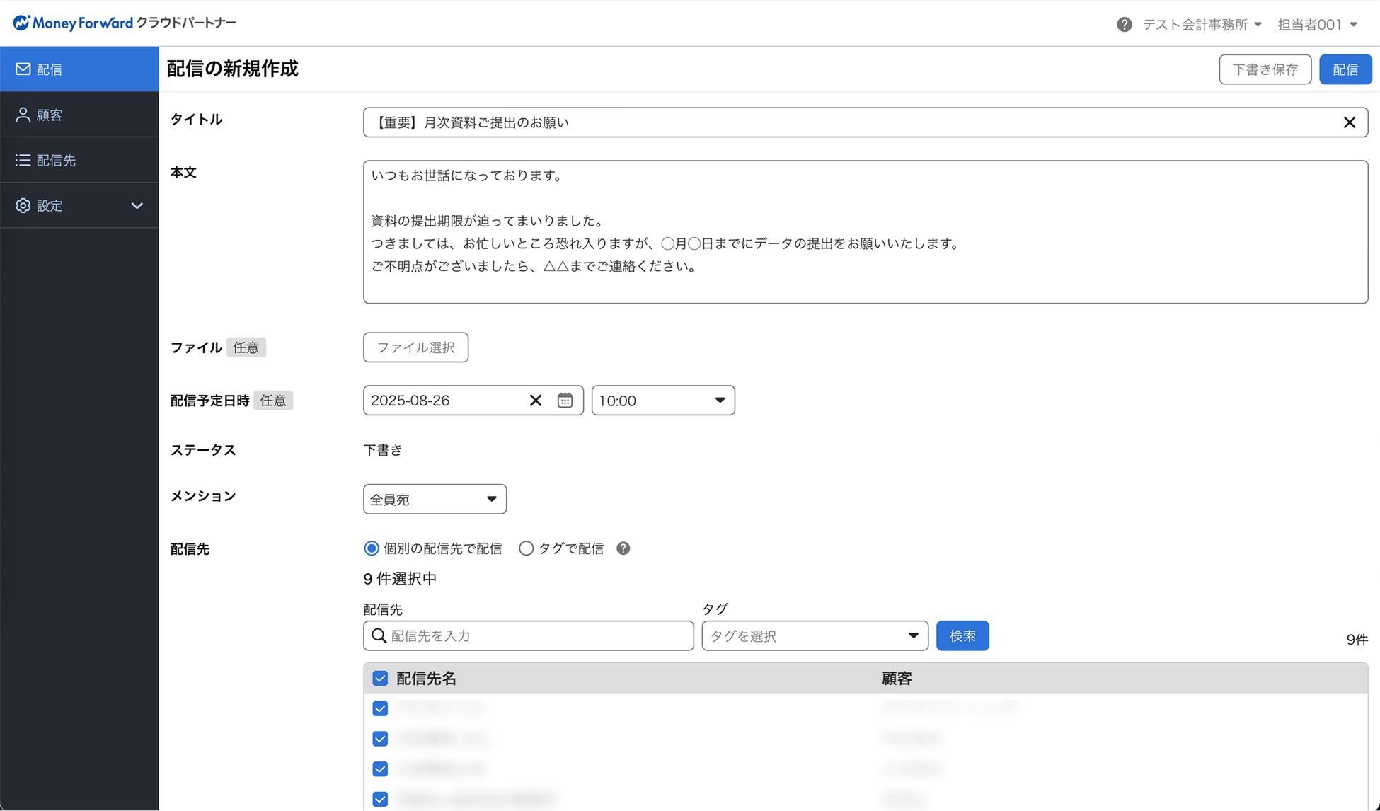 「年末調整」や「納期の特例」といったタグを用いて顧客を自由に分類することができます。これにより、煩雑なリスト作成の手間を軽減し、必要な情報を必要な相手に迅速に届けることが可能です。