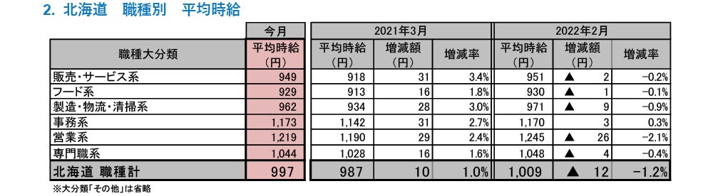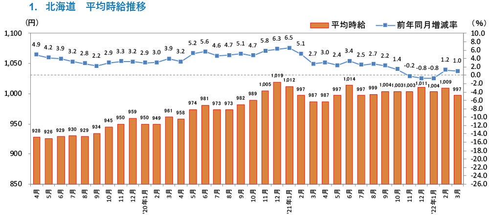 [北海道版]2022年3月度 アルバイト・パート募集時平均時給調査 北海道の3月度平均時給は前年同月より10円増加の997円