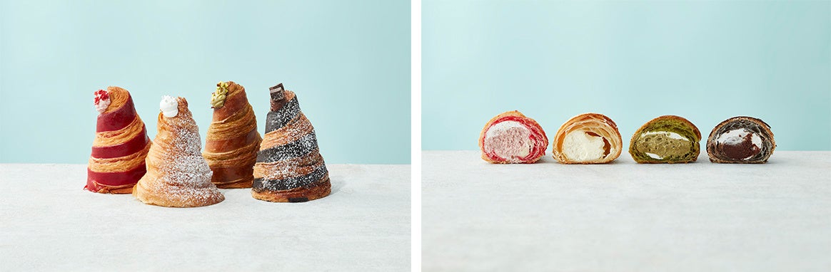 プレーン・チョコレート・フランボワーズ・ピスタチオの4種類のフレーバーをご用意します。人気商品の「クロワッサン」の中に自家製クリーム(各種)とサワークリームが入った少し酸味のある生クリームを絞り入れた、見た目も風味も楽しい新たな進化系クロワッサン。