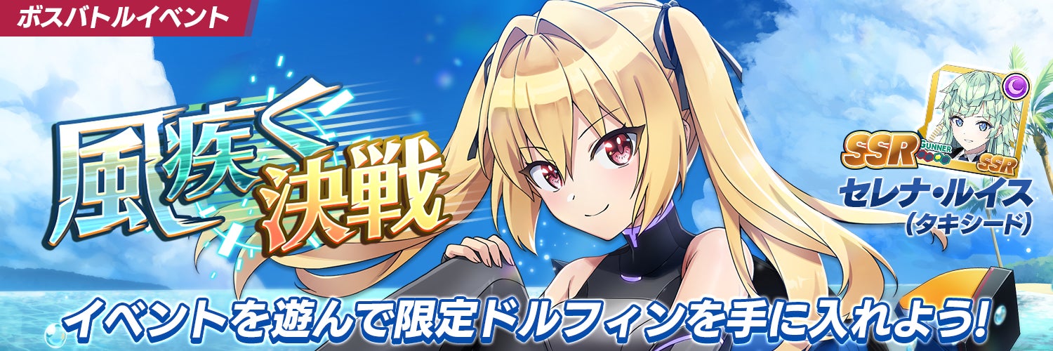 4/20(木)より、ボスバトルイベント「風疾く決戦」を開催いたします。期間限定ボスをすると獲得できる「ボスメダル(風疾く)」は、専用のショップでイベント限定SSRドルフィンやドルフィン強化素材等、様々な報酬と交換することができます。たくさんメダルを集めて、報酬を獲得しましょう!