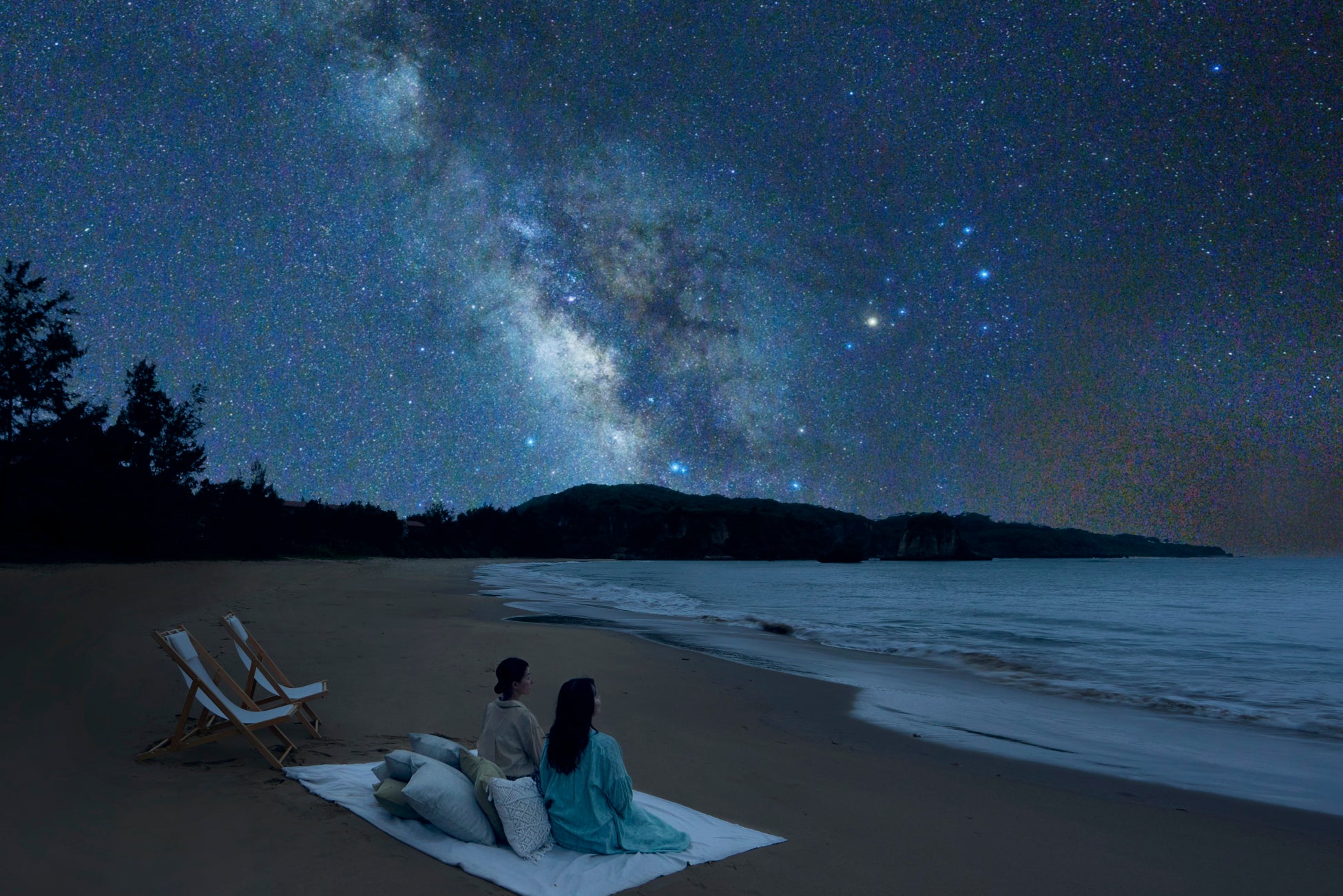 ホテル目の前の月ヶ浜では、水平線から頭上を越えてさらに後方まで広がる、プラネタリウムを超える星空の絶景を楽しめます。その絶景を快適に楽しむために、ビーチマットやクッションなどを設えた星空観賞の空間を用意。寝転びながら鑑賞できるので、波の音に耳を傾けながらゆったりと星空を楽しむことができます。