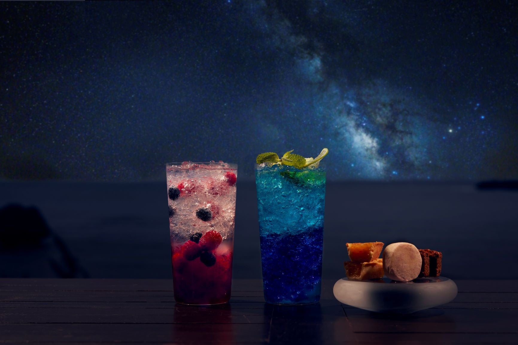 月ヶ浜での星空観賞をゆったりと楽しめるように、二種類のオリジナルドリンクを用意します。夜の海と星々が溶け合う様子を表現したブルーのドリンクや空に瞬く星屑を思わせるルビーレッドのドリンクなど特別な星空をイメージしています。ドリンクを片手に星空を観賞をすることで、より贅沢な時間を過ごせます。