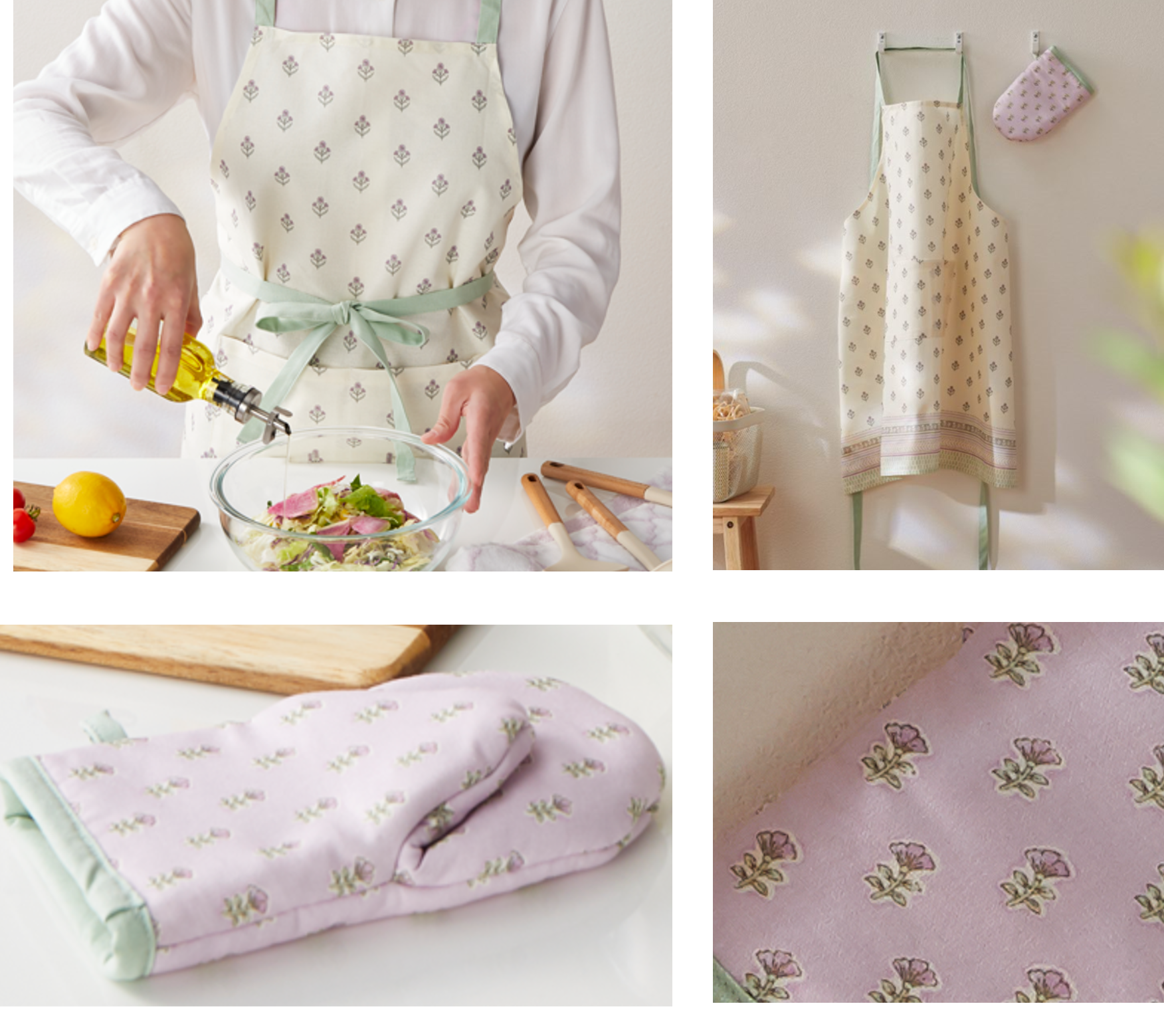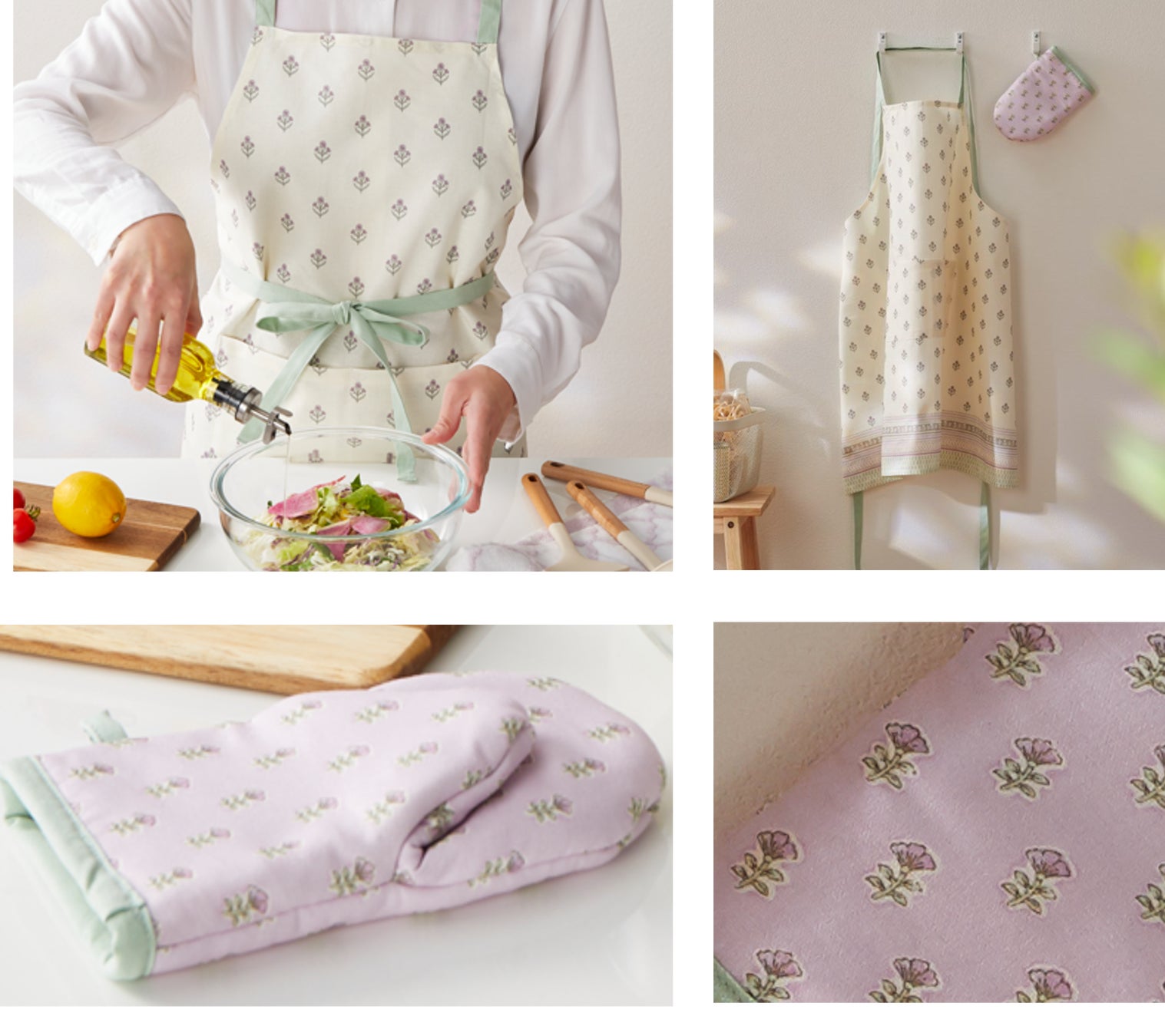 【キッチン小物で、春にチェンジ。】エプロンやミトンも春色にそろえて、いつもの料理をもっと楽しく。