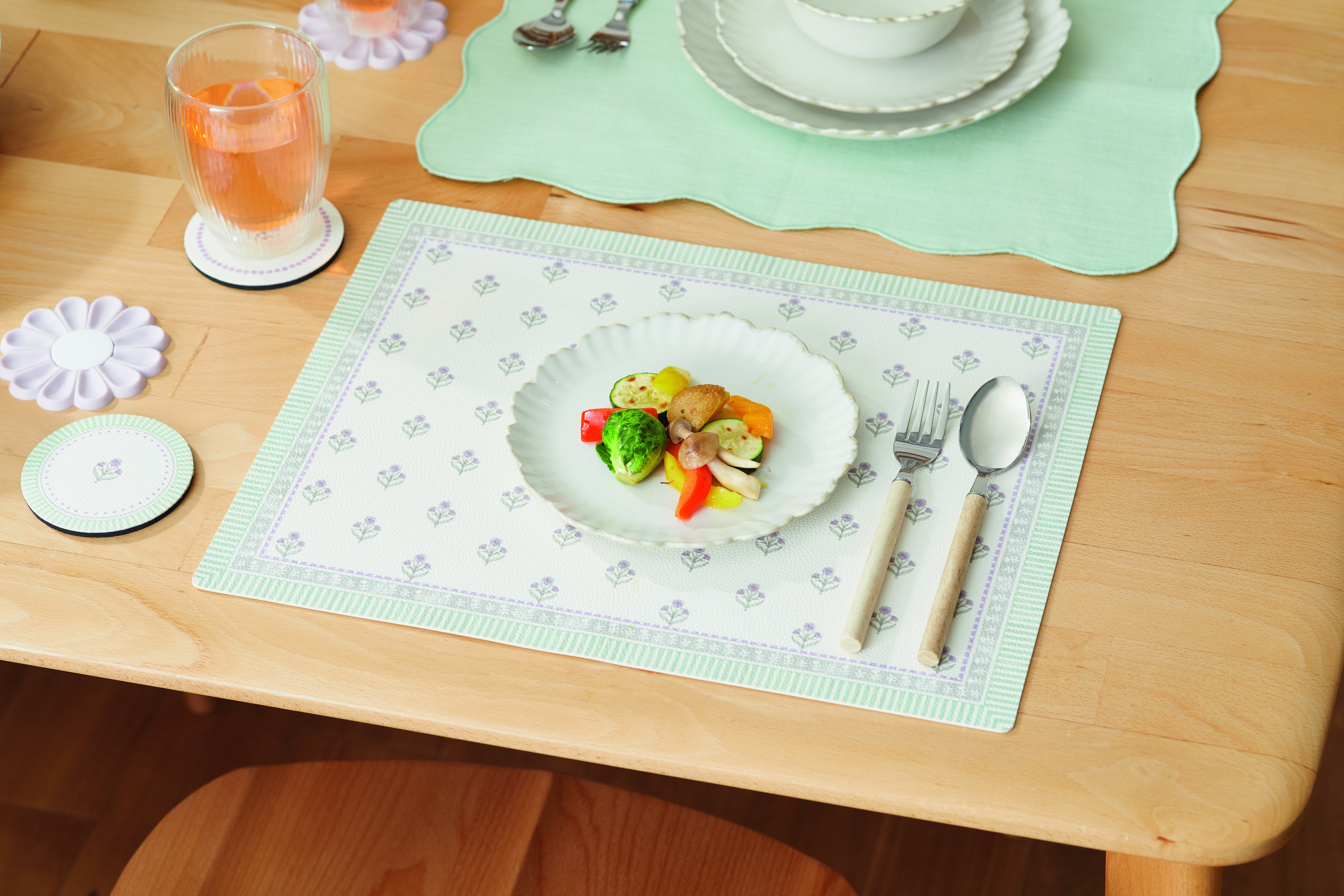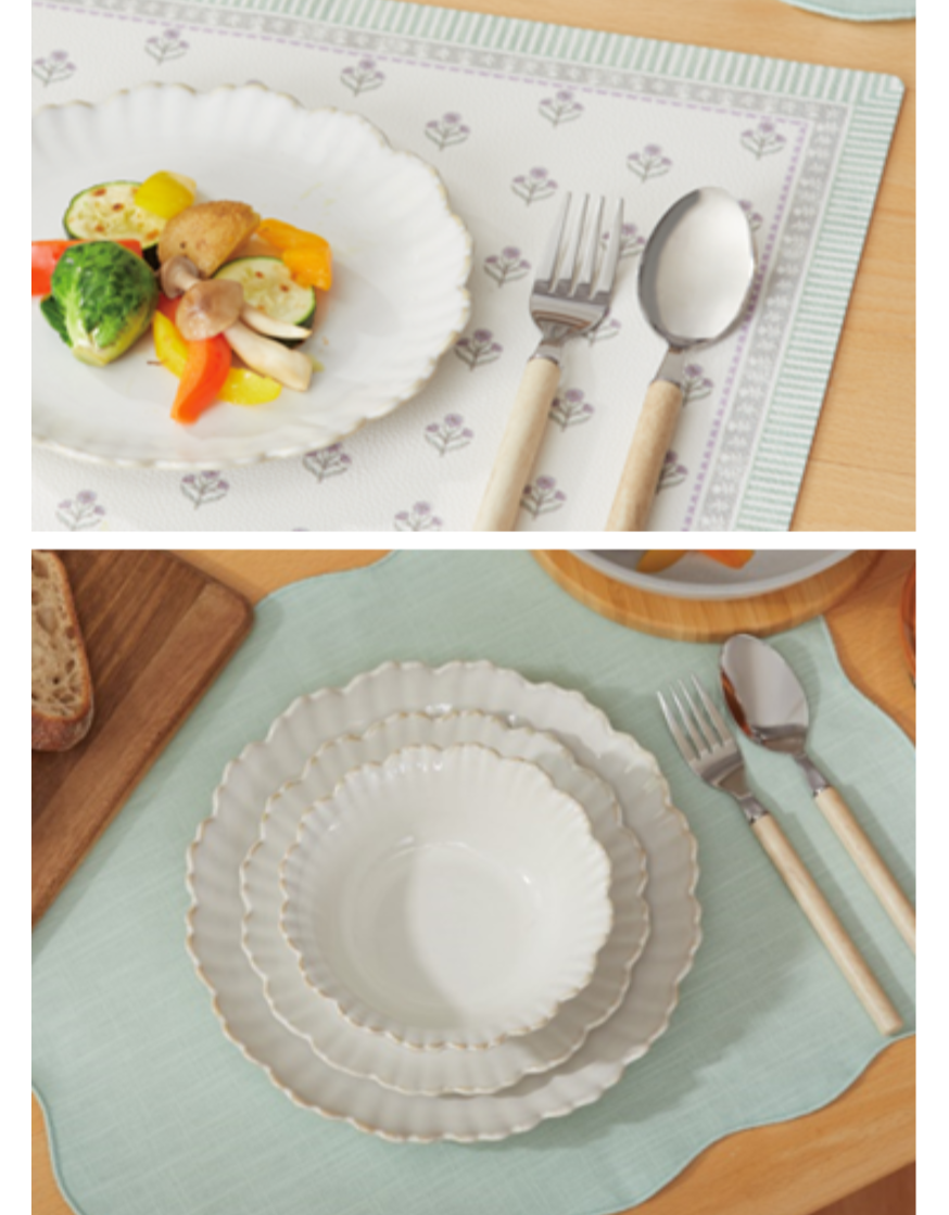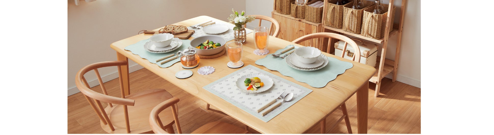 【ダイニング小物で、春にチェンジ。】やさしいカラーのランチョンマットやお花のかたちの食器で春気分UP。