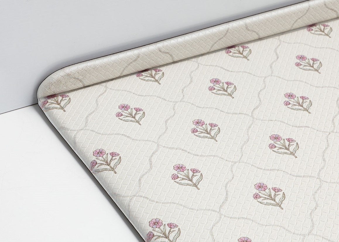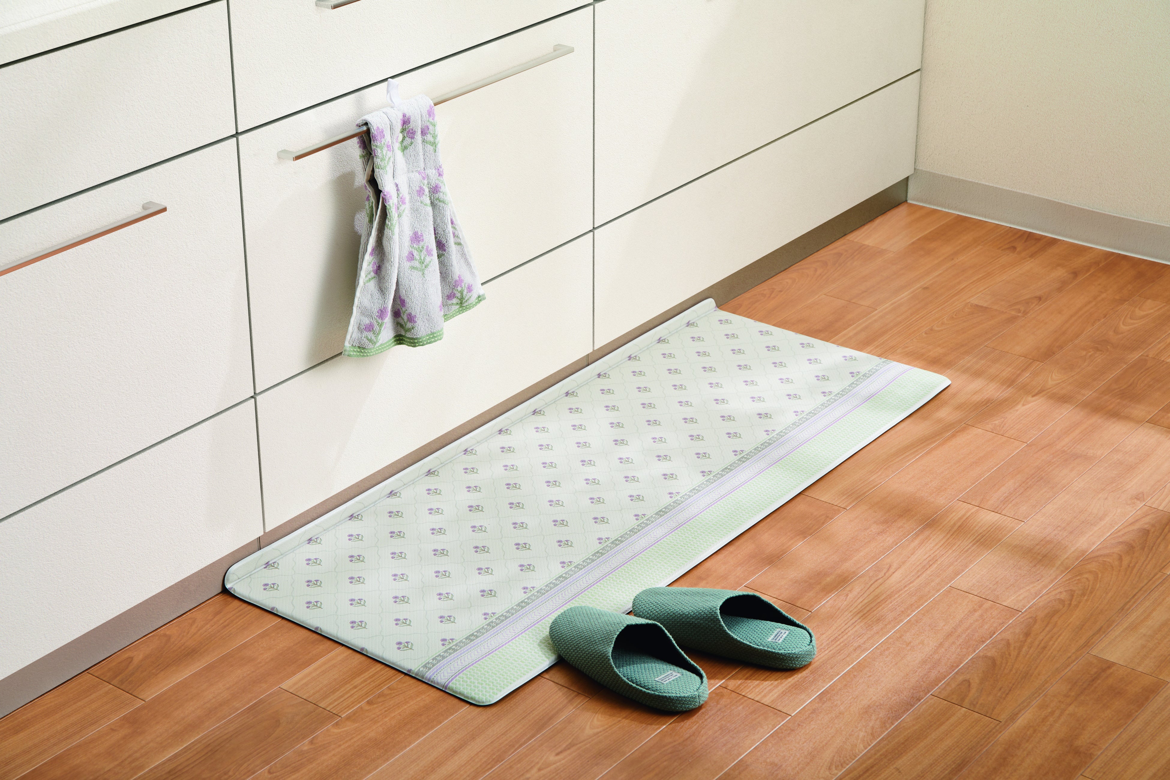 クッション性のあるマットで、立ち仕事も疲れにくく。汚れやごみがすき間に入りにくいL字の折り目つき。