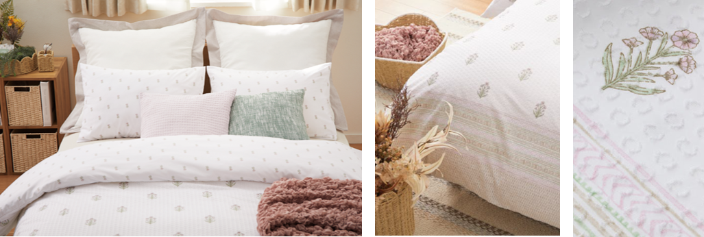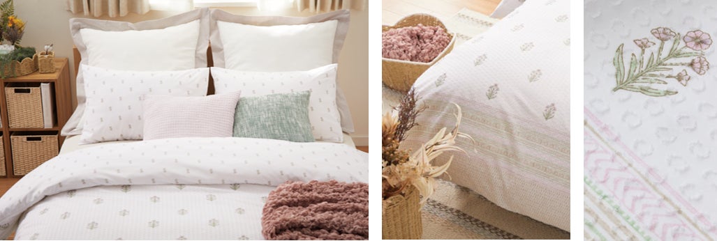 【ふとんカバーから、寝室を春にチェンジ。】冬用のふとんをしまったら、淡くやさしい色合いのカバーに替えて、一気に春らしく。
