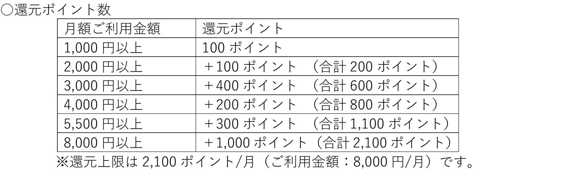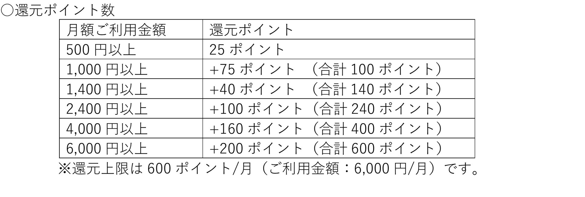 各月の対象店舗でのご利用金額に応じて、WESTERポイント(期間・用途限定)を還元します。なおご利用金額は毎月1日0:00:00~末日23:59:59の集計となります。