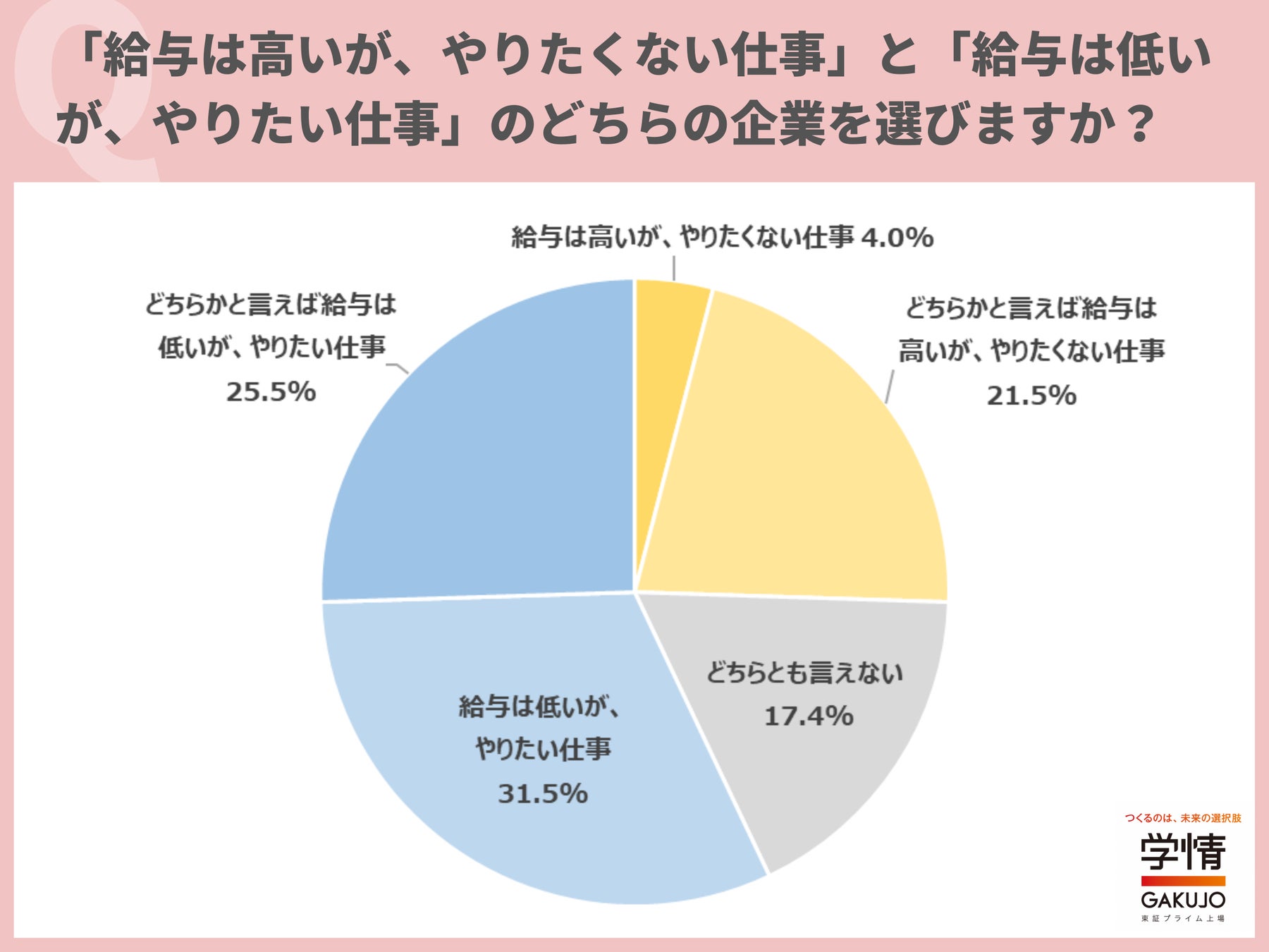 「給与の高さ」と「やりたい仕事」との優先度についても聞きました。「給与は低いが、やりたい仕事」との回答が31.5%で最多。「どちらかと言えば」25.5%と合わせると、「やりたい仕事」優先派が57.0%で多数を占めました。「給与は高いが、やりたくない仕事」は4.0%にとどまり、「どちらかと言えば」21.5%と合わせても25.5%でした。「やりたくない仕事だと幸福度が下がる」「やりたくない仕事をして心身を壊したら本末転倒」「やりたくない仕事は給与がよくても長続きしなさそう」「興味があるほうが自分も成長していける」「よほど低い給料でなければ、やりたい仕事に就きたい」などの声が寄せられました。