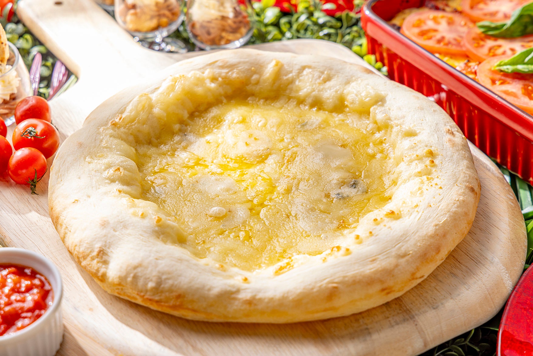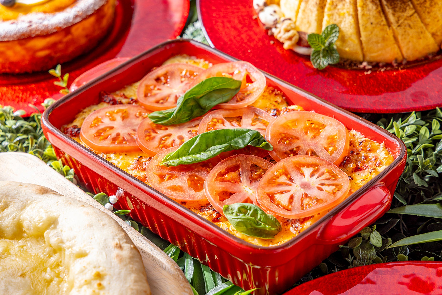 ローストビーフ(サルサヴェルデソース/和風おろしソース)/ミラノ風ポークカツレツ&パターテアルフォルノ/鶏もも肉のコンフィ 粒マスタード添え/白身魚の白ワイン蒸し デュクレレ風ソース/ピッツァ マルゲリータ/本日のピッツア/小海老のリゾットサフラン風味/ジェノベーゼ/トマトのラザニア/イタリアンオムレツ/ミネストローネスープ/そら豆の冷製ポタージュスープほか