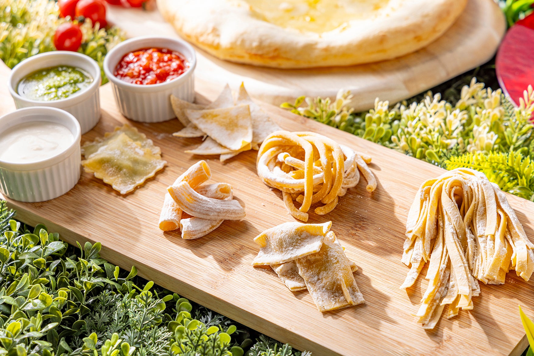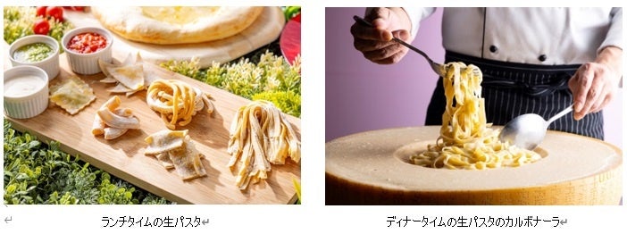 ランチタイムには、タリアテッレ、ストラッチ、アニョロッティ、ニョッキ、リガトーニ、ラビオリなどの「生パスタ」を目の前で茹でて、ジェノベーゼソース、トマトソース、ホワイトソースで絡めてご提供いたします。ディナータイムには、パルメジャーノレッジャーノの器に茹でたて生パスタをからめ、カルボナーラでお召し上がりいただけます。
