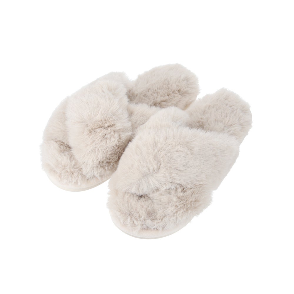 毛足の長いファーを使ったふわふわでボリューミーなスリッパ。クッション性のあるウレタン素材の中敷きにより、フィット感のある履き心地に。