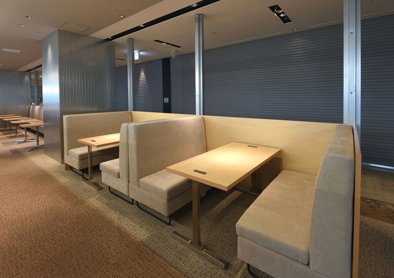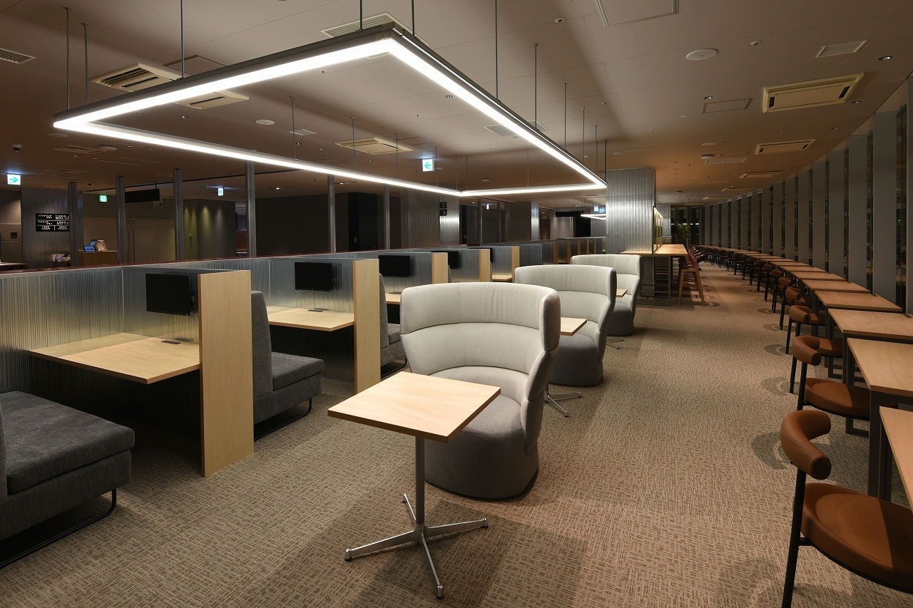 大きな窓に面し自然光が気持ちよい空間に、ドリンクやフードを楽しみながら複数人でご利用いただけるソファ席やボックス席、仕事や勉強・読書などプライベートな1人時間にお使いいただけるワークスペース席、眺望を楽しみながら時間を過ごせる窓際席など、多様な席種を107席備えています。