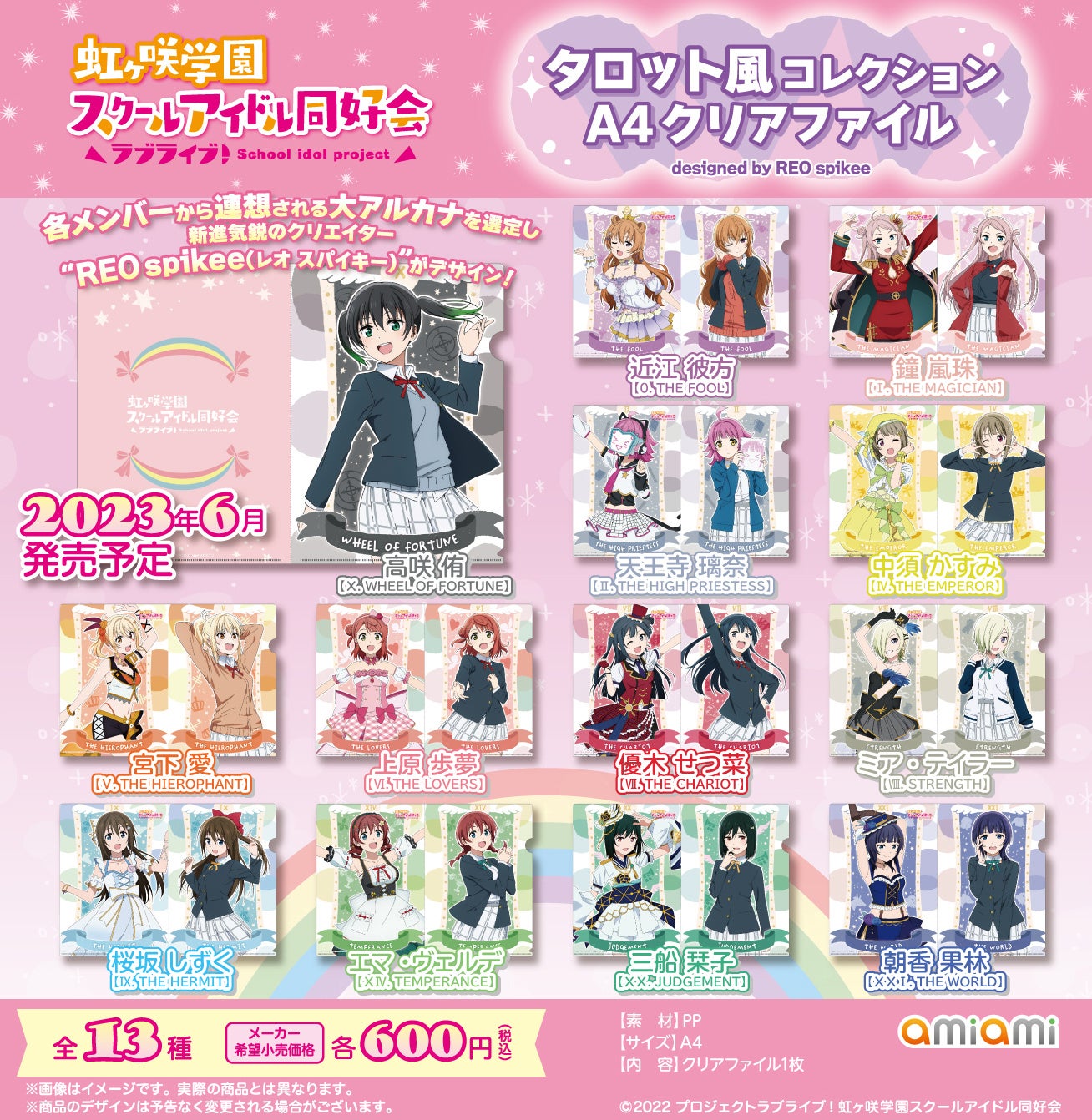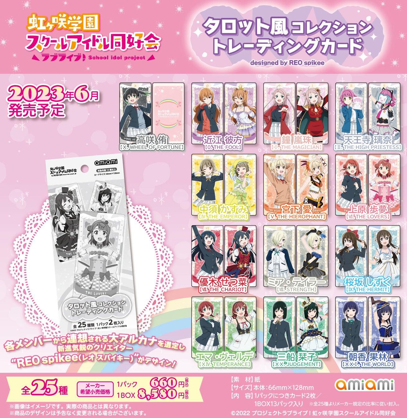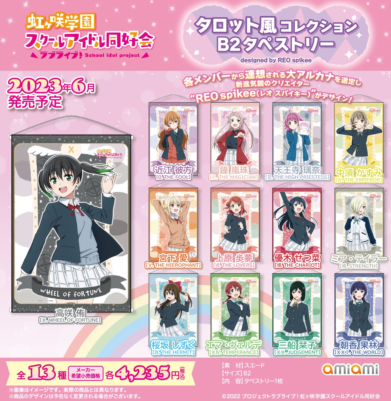 フィギュア&ホビー通販大手の「あみあみ」を運営する、大網株式会社(本社・東京都文京区)は、『ラブライブ!虹ヶ咲学園スクールアイドル同好会』より「タロット風コレクション」シリーズの「トレーディングカード」「A4クリアファイル」「B2タペストリー」を、2023年6月予定で発売いたします。