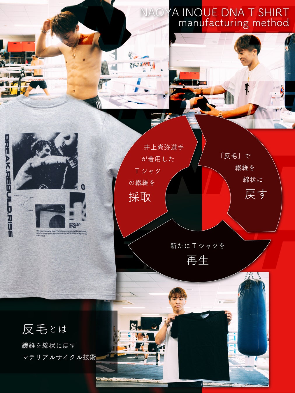 マテリアルリサイクル技術(繊維を機械で綿状に戻す反毛技術)を活用し、井上選手の練習拠点である横浜市に所在する「大橋ボクシングジム」と連携して制作された、特別な一枚です。