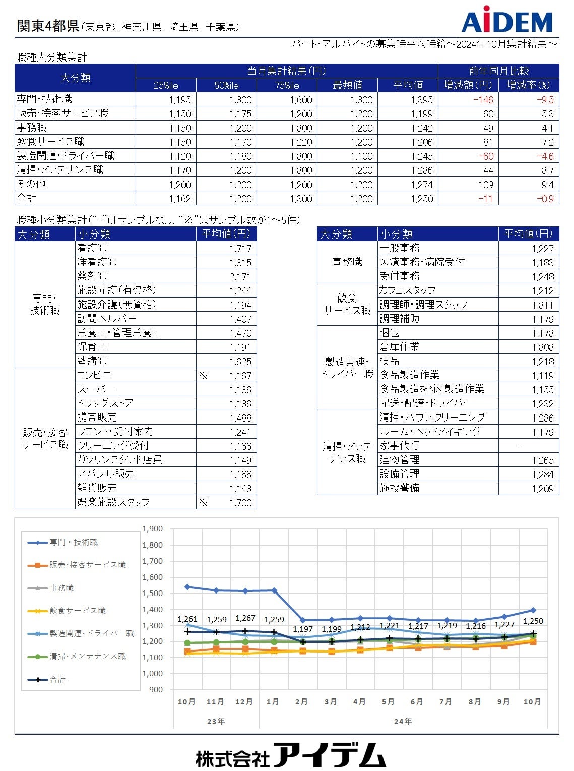 総合人材情報サービスの株式会社アイデム(本社:東京都新宿区 代表取締役社長:椛山 亮)は、求人メディア『イーアイデム』や採用ホームページ構築サービス『Jobギア採促』を利用して公表された求人情報から、2024年10月のパート・アルバイト募集時平均時給を集計いたしました。