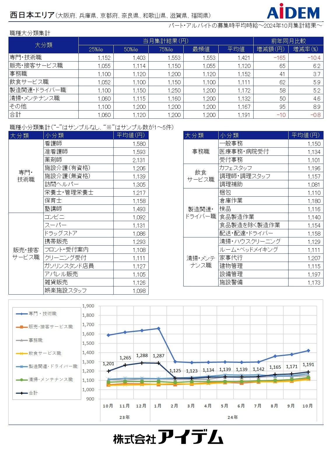 職種大分類別の平均時給は、「専門・技術職」1,405円(前年同月比175円減)、「製造関連・ドライバー職」1,181円(同38円増)、「事務職」1,165円(同39円増)、「清掃・メンテナンス職」1,143円(同52円増)、「飲食サービス職」1,134円(同63円増)、「販売・接客サービス職」1,132円(同63円増)の順で、前年同月比でプラスが5職種、マイナスが1職種となった。府県別の平均時給は、大阪府1,236円(前年同月比48円減)、京都府1,166円(同62円増)、兵庫県1,161円(同6円減)の順となり、前年同月比でプラスが1府、マイナスが2府県となった。