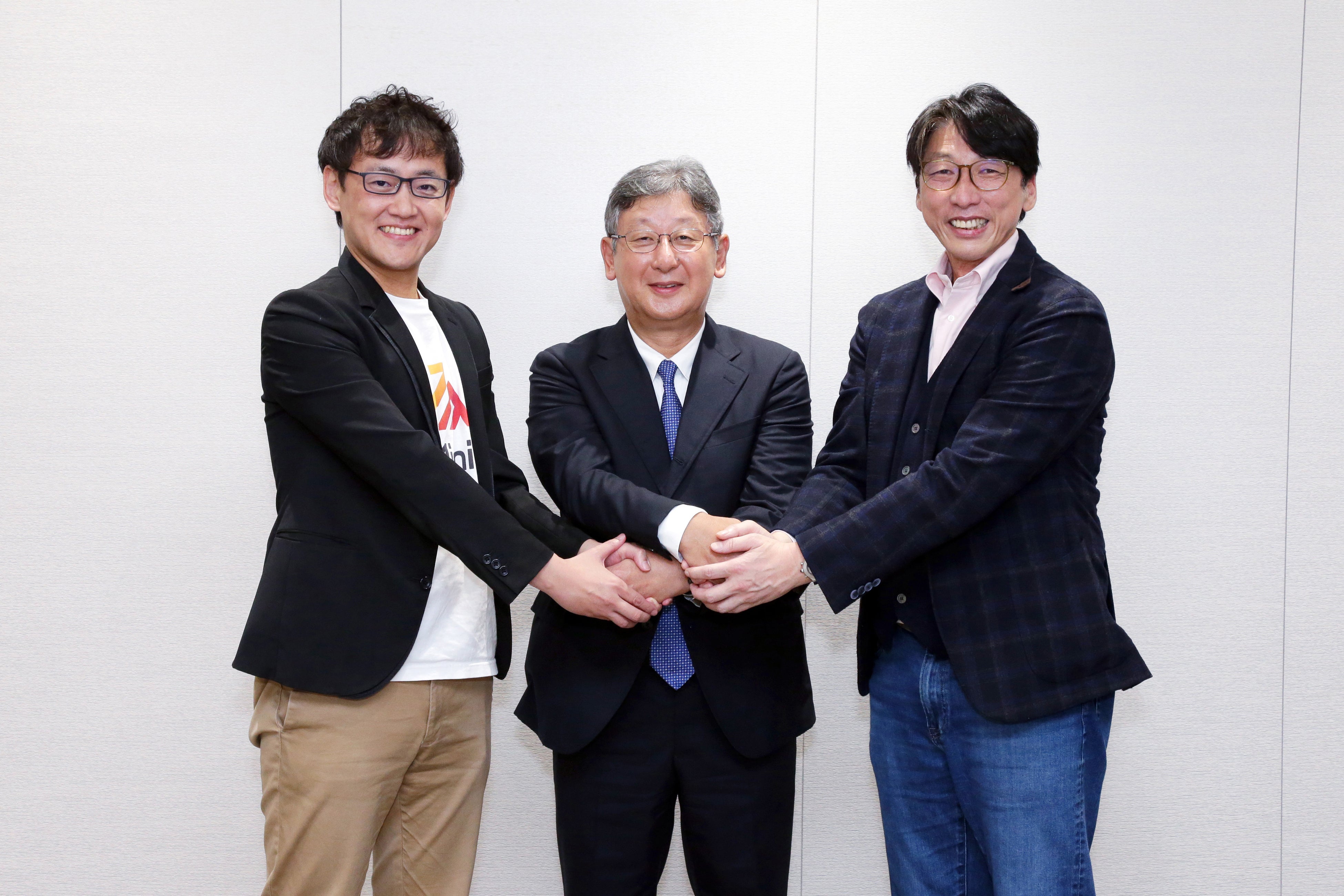DEA社 山田耕三 Co-CEO(左)、テレビ東京 石川一郎 社長(中央)、DEA社 吉田直人 CEO(右)