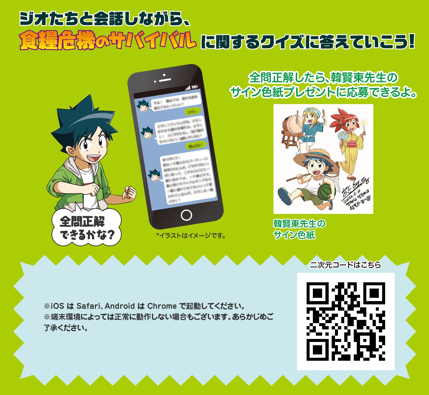 主人公ジオと会話しながら、「食糧危機のサバイバル」に関するクイズに答えていこう!全問正解した方の中から、韓賢東先生が特別に描きおろしたサイン色紙(複製)を100名様にプレゼント。全問正解後に現れるフォームからご応募いただけます。