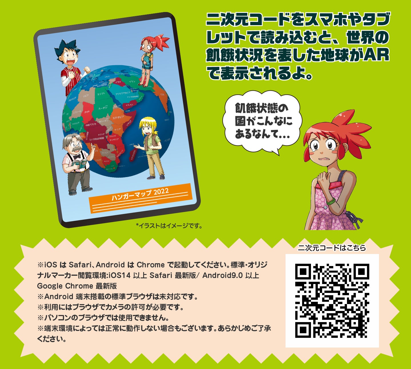 二次元コードをスマホやタブレットで読み込むと、世界の飢餓状況を表した地球がARで表示されます。ジオ、ピピ、ケイ、ノウ博士などキャラクターたちのコメントも要チェック!