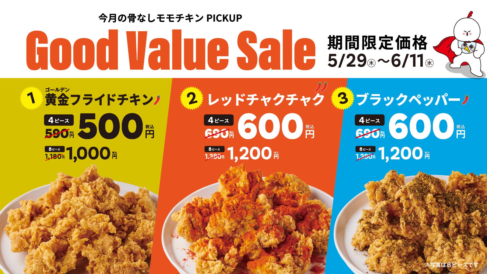 今回のキャンペーンでは、前回大好評だった「骨なしモモ黄金フライドチキン(4ピース)」500円(税込)に加え、「骨なしモモレッドチャクチャクチキン(4ピース)」「骨なしモモブラックペッパーチキン(4ピース)」の2フレーバーが対象となり、特別価格600円(税込)でご提供いたします。ジューシーで柔らかな骨なしモモ肉を使った、人気の味3種類をお得な価格でお楽しみいただけます。