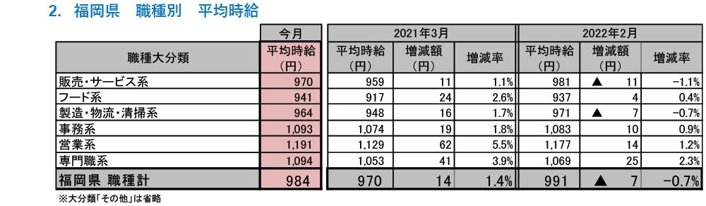 [福岡県版]2022年3月度 アルバイト・パート募集時平均時給調査 福岡県の3月度平均時給は前年同月より14円増加の984円