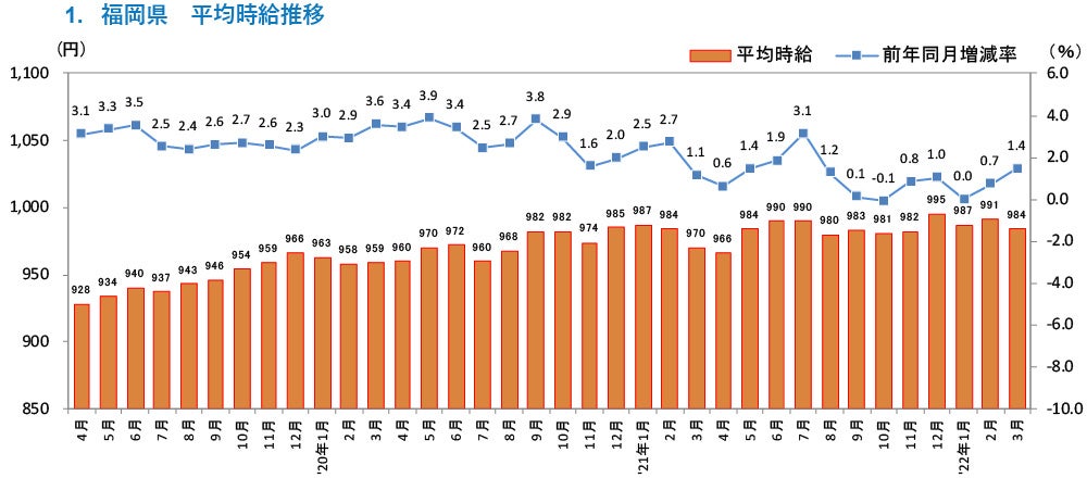 ■福岡県の平均時給は984円(前年同月970円、前月991円)