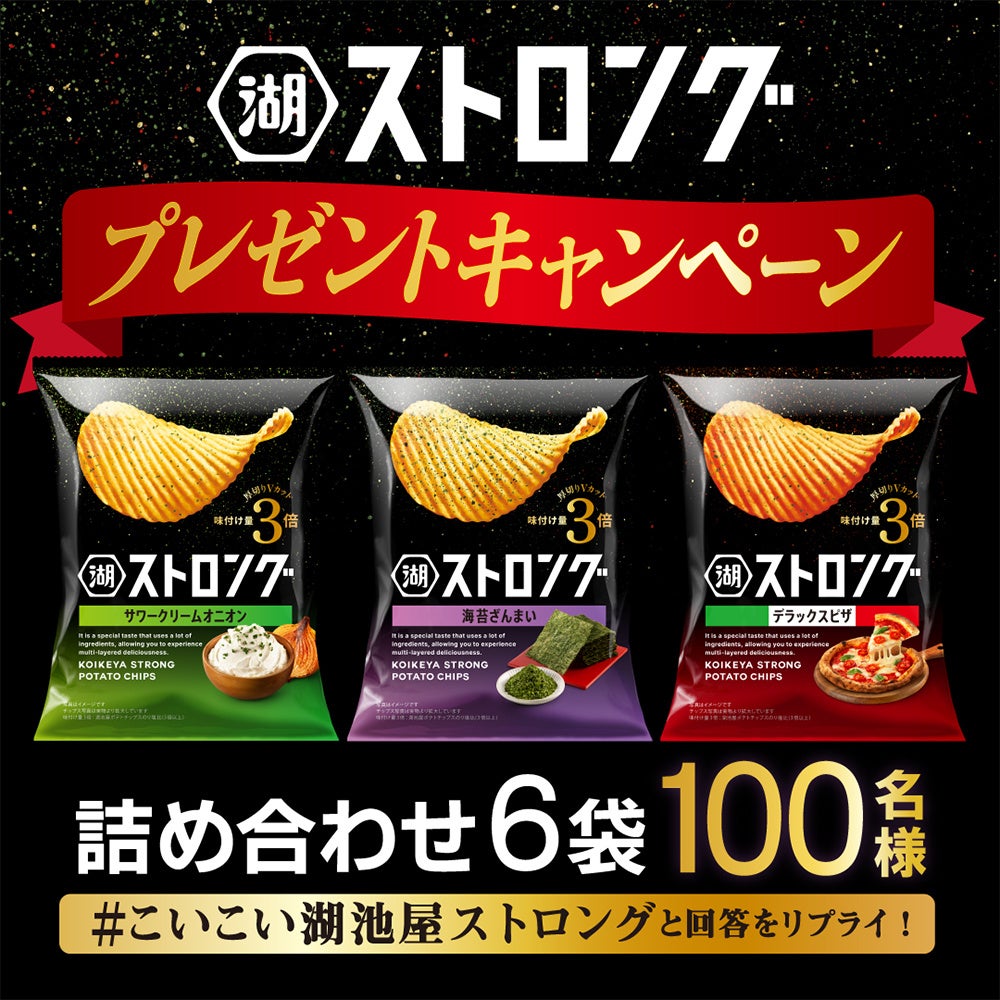 「湖池屋ストロング」のフルリニューアルを記念して、新「湖池屋ストロング」3品をセットにして100名様にプレゼントするキャンペーンを実施します。今回のキャンペーンは、Xで湖池屋(@koikeya_cp)をフォロー&リポストの上、キャンペーン投稿に記載の質問への回答をリプライしていただくことで応募完了。質問は毎日変わり、毎日参加可能ですので、ぜひキャンペーンにご参加ください!