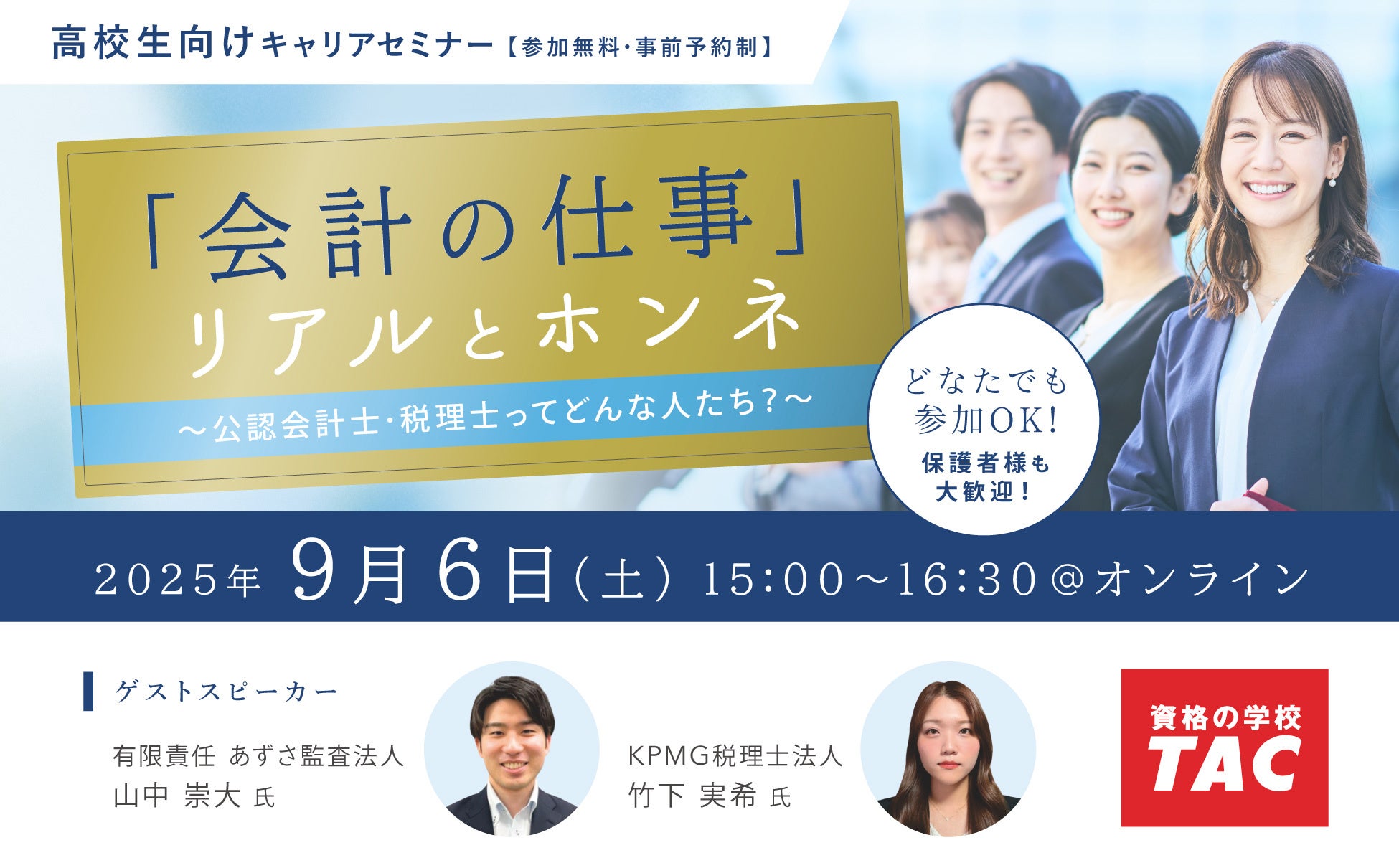 簿記検定試験、税理士、公認会計士などの資格取得に向けた教育サービスを展開しているTAC株式会社(東京都千代田区、代表取締役:多田 敏男)は、2025年9月6日(土) 15:00より、オンラインで高校生向け会計キャリアセミナーを開催します。