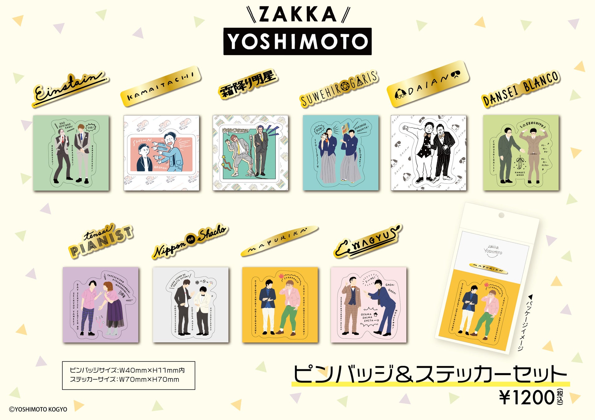 5月14日(土)からは新イラストとして男性ブランコ、マユリカ、天才ピアニストのグッズと、新アイテムのピンバッジ&ステッカーセット10種が発売となります。定期的に企画が入れ替わっていきますので、今後の情報や新しい企画は公式Twitter(@popupYOSHIMOTO)をご覧ください。