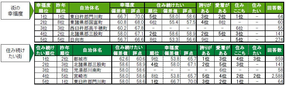 ※幸福度ランキング:3位西臼杵郡高千穂町は、2021年~2025年の累計回答数が50名未満で、2020年回答を含めても50名に達しなかったため、「住み続けたい」「誇りがある」「愛着がある」の集計対象外となっています。そのため「-」と表記しています。