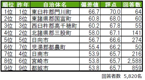 1位は都城市で、昨年2位から一つ順位を上げました。2位は北諸県郡三股町(昨年3位)、3位は児湯郡川南町(昨年8位)で、いずれも昨年から順位を上げました。トップ10内で今回初登場の自治体は9位の児湯郡都農町(こゆぐん つのちょう)で、昨年は累計回答者数が50名未満でランキングの集計対象外でした。その他、昨年は偏差値50未満で順位非公開だった延岡市が、今年は10位となっています。